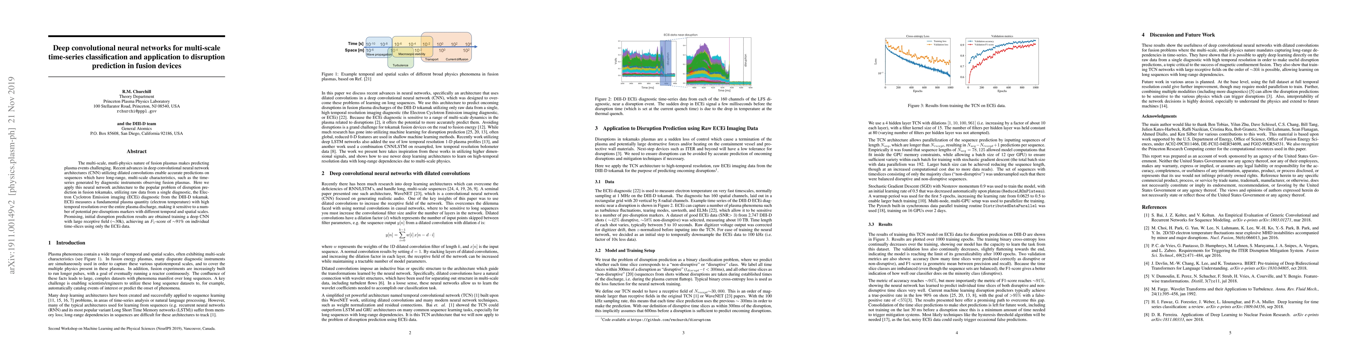 The multi-scale, mutli-physics nature of fusion plasmas makes predicting plasma events challenging. Recent advances in deep convolutional neural network architectures (CNN) utilizing dilated convolutions enable accurate predictions on sequences which have long-range, multi-scale characteristics, such as the time-series generated by diagnostic instruments observing fusion plasmas. Here we apply this neural network architecture to the popular problem of disruption prediction in fusion tokamaks, utilizing raw data from a single diagnostic, the Electron Cyclotron Emission imaging (ECEi) diagnostic from the DIII-D tokamak. ECEi measures a fundamental plasma quantity (electron temperature) with high temporal resolution over the entire plasma discharge, making it sensitive to a number of potential pre-disruptions markers with different temporal and spatial scales. Promising, initial disruption prediction results are obtained training a deep CNN with large receptive field (~30k), achieving an $F_1$-score of ~91% on individual time-slices using only the ECEi data.