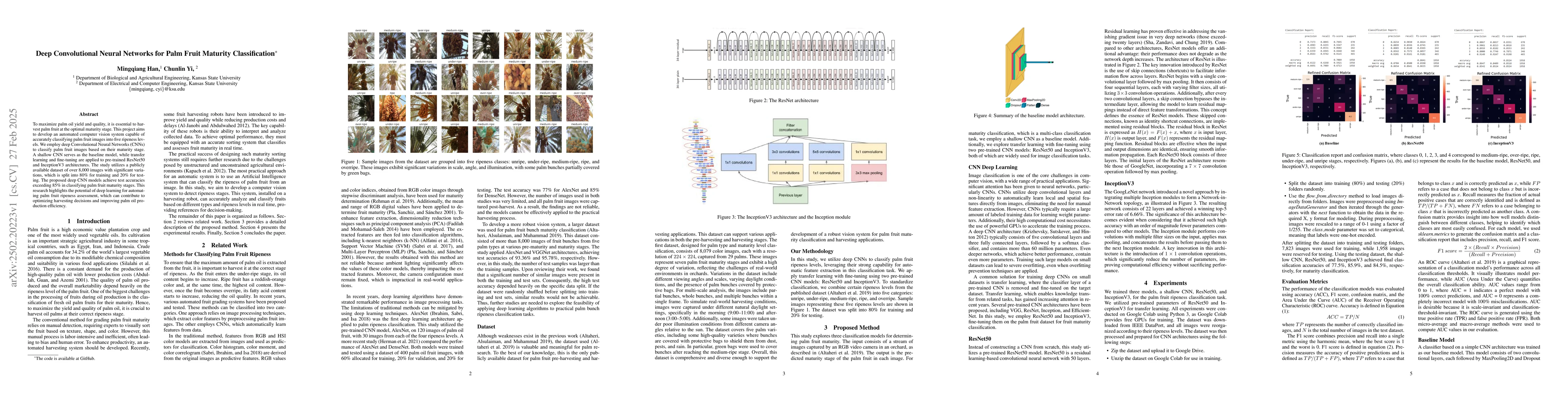 This study utilizes deep Convolutional Neural Networks (CNNs) for classifying palm fruit images into five maturity stages. Transfer learning and fine-tuning are applied to pre-trained ResNet50 and InceptionV3 architectures using a dataset of over 8,000 images split into 80% for training and 20% for testing.