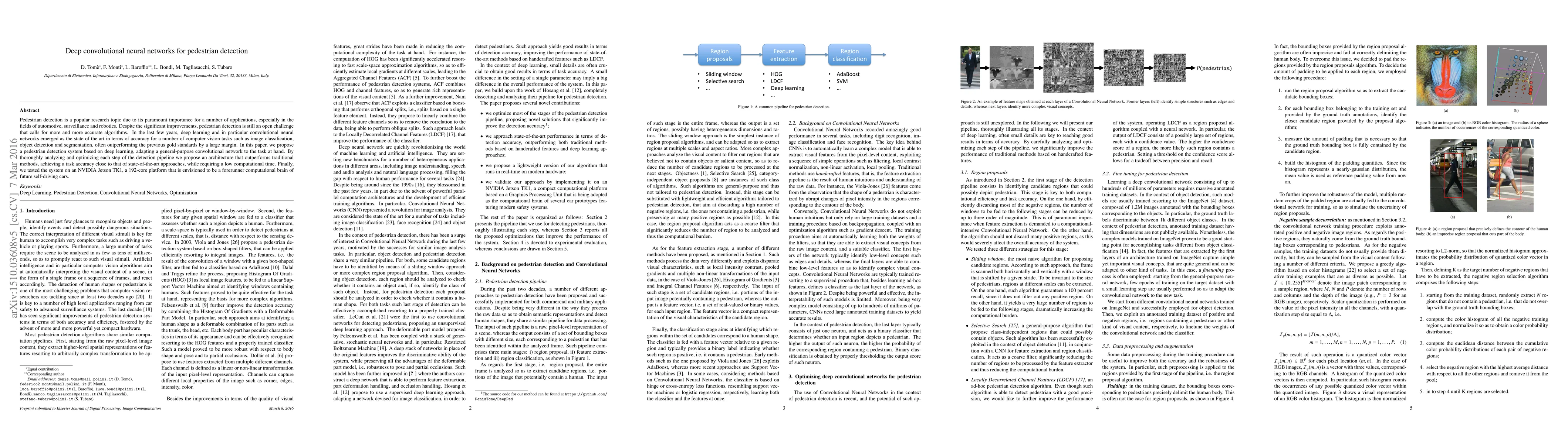 This paper proposes a deep convolutional neural network for pedestrian detection, achieving high accuracy and low computational time. The optimized architecture outperforms traditional methods and is tested on an NVIDIA Jetson TK1 platform for potential use in self-driving cars.