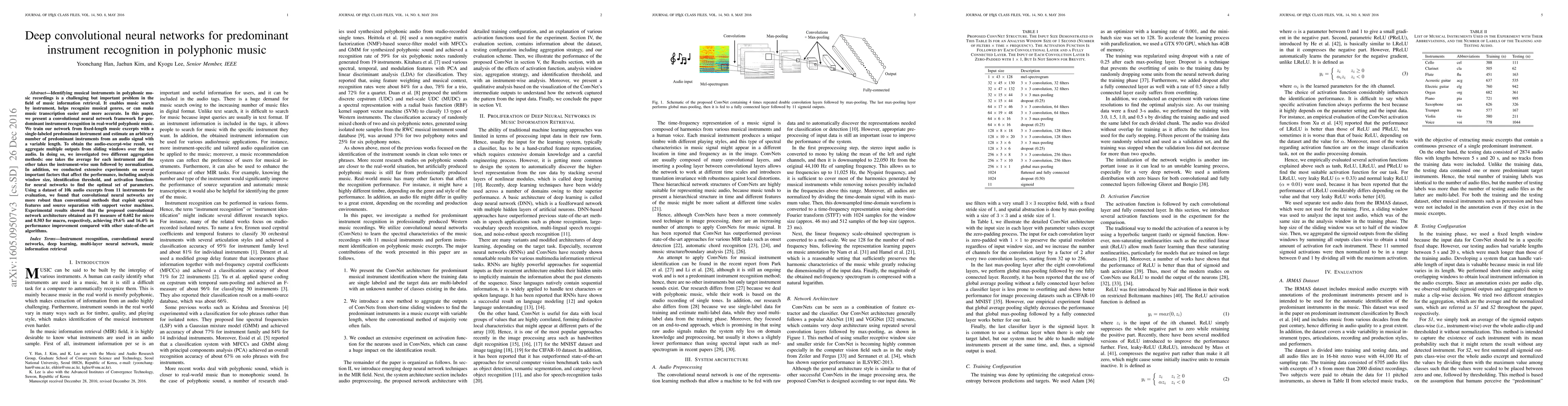 This paper proposes a convolutional neural network framework for recognizing predominant instruments in polyphonic music, achieving significant performance improvements over conventional methods. The network, trained on labeled excerpts, estimates instruments from variable-length audio signals using aggregation techniques, and optimizes parameters like window size and activation functions.