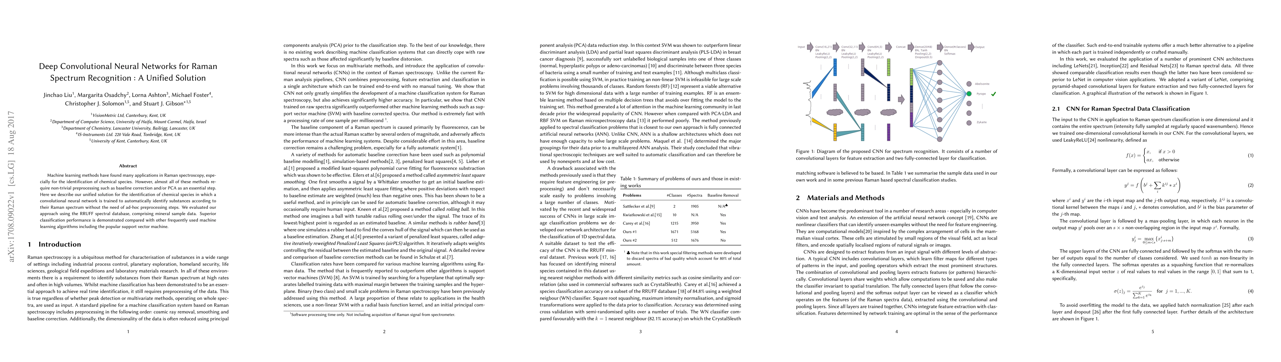 This paper proposes a deep convolutional neural network for automatic identification of chemical species from Raman spectra, eliminating the need for preprocessing steps like baseline correction or PCA. The approach was evaluated on the RRUFF spectral database, showing superior classification performance compared to traditional machine learning methods such as support vector machines.