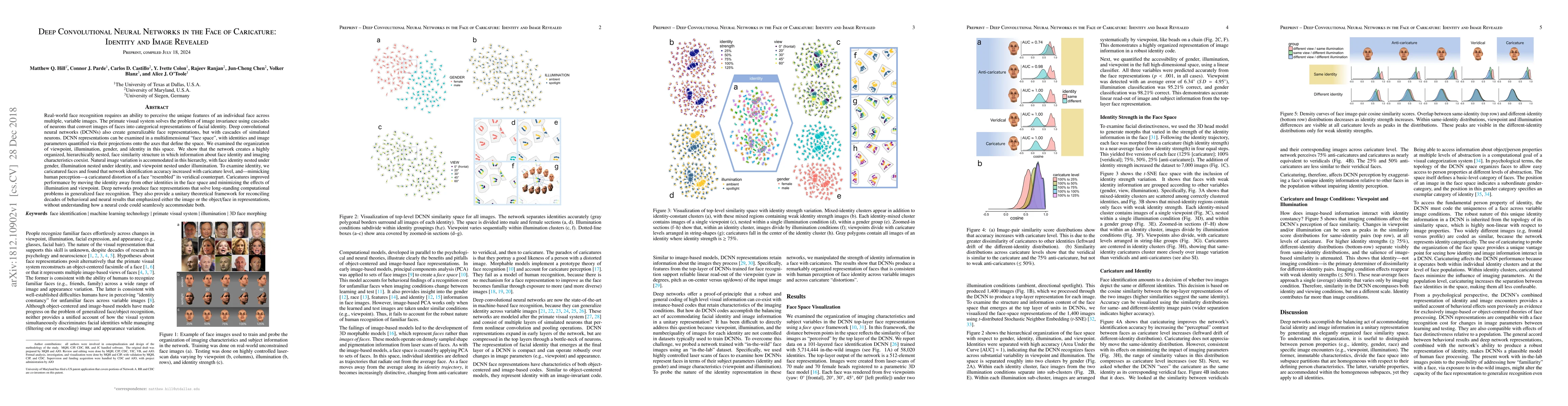 This paper explores how deep convolutional neural networks (DCNNs) represent faces in a multidimensional "face space," revealing a hierarchical structure where identity, gender, illumination, and viewpoint are organized. Caricatures enhance network identification accuracy by emphasizing identity and reducing the impact of other factors, mirroring human perception.