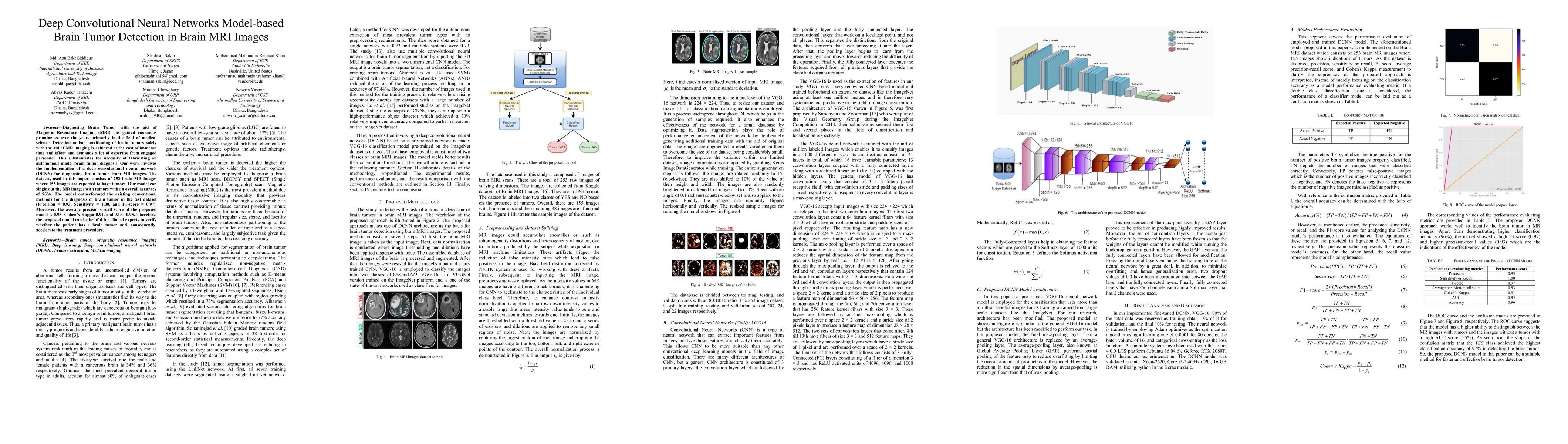 This paper presents a deep convolutional neural network (DCNN) model for detecting brain tumors in MRI images, achieving an overall accuracy of 96% and outperforming conventional methods. The model demonstrates high precision, sensitivity, and F1-score, potentially aiding clinicians in expediting the diagnosis process.