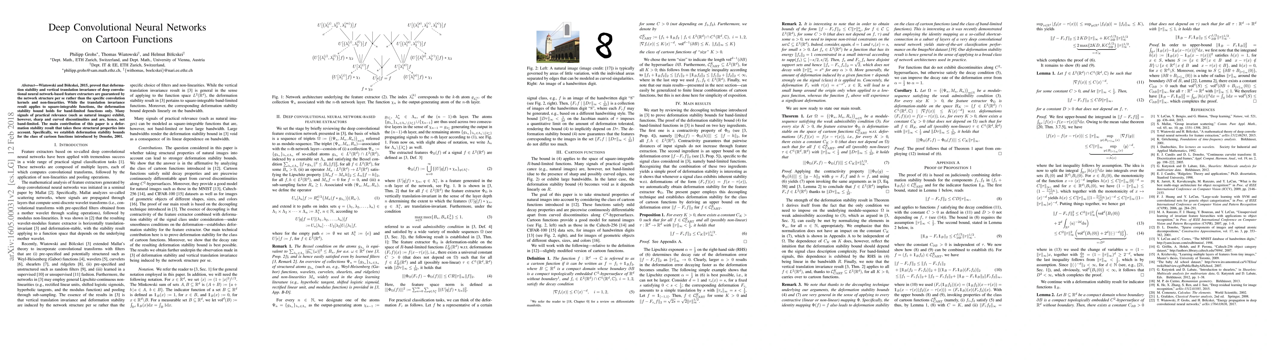 This paper proves deformation stability bounds for cartoon functions, a class of functions that account for sharp and curved discontinuities found in natural images, extending previous results on deep convolutional neural networks.