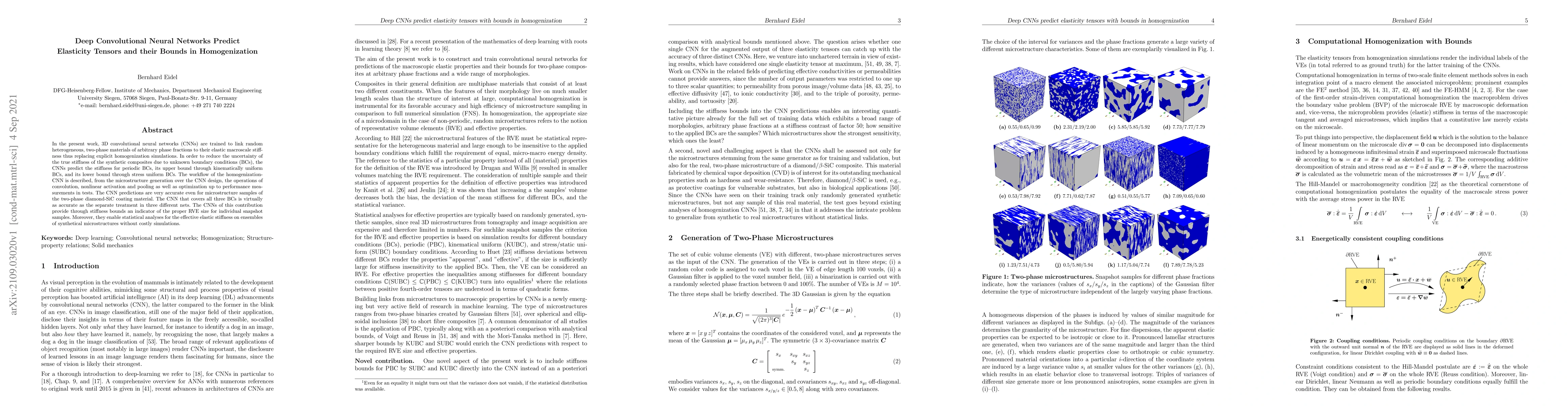 In the present work, 3D convolutional neural networks (CNNs) are trained to link random heterogeneous, two-phase materials of arbitrary phase fractions to their elastic macroscale stiffness thus replacing explicit homogenization simulations. In order to reduce the uncertainty of the true stiffness of the synthetic composites due to unknown boundary conditions (BCs), the CNNs predict beyond the stiffness for periodic BC the upper bound through kinematically uniform BC, and the lower bound through stress uniform BC. This work describes the workflow of the homogenization-CNN, from microstructure generation over the CNN design, the operations of convolution, nonlinear activation and pooling as well as training and validation along with backpropagation up to performance measurements in tests. Therein the CNNs demonstrate the predictive accuracy not only for the standard test set but also for samples of the real, two-phase microstructure of a diamond-based coating. The CNN that covers all three boundary types is virtually as accurate as the separate treatment in three different nets. The CNNs of this contribution provide through stiffness bounds an indicator of the proper RVE size for individual snapshot samples. Moreover, they enable statistical analyses for the effective elastic stiffness on ensembles of synthetical microstructures without costly simulations.