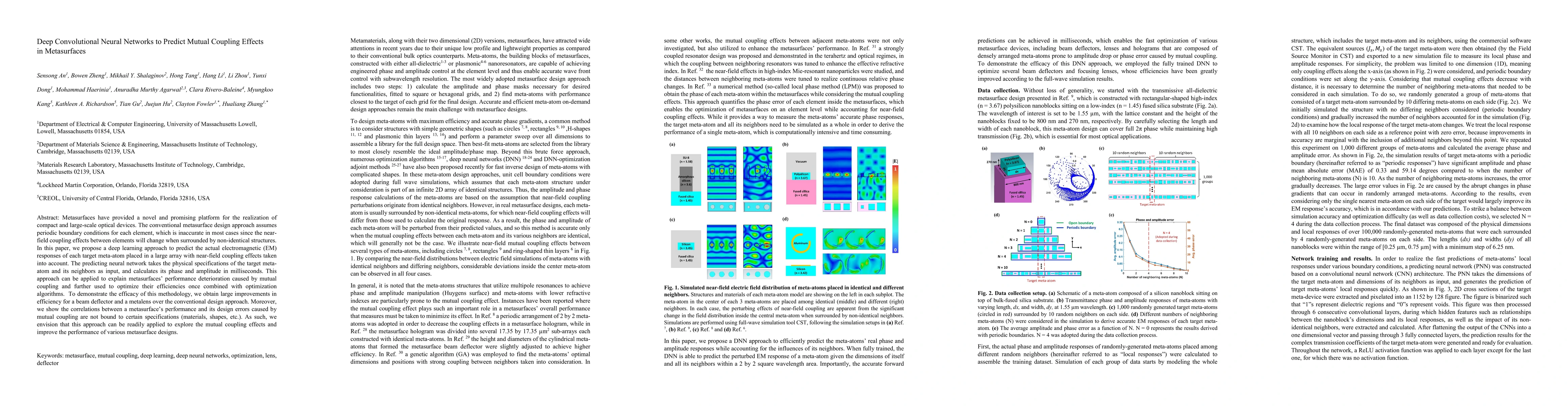 Metasurfaces have provided a novel and promising platform for the realization of compact and large-scale optical devices. The conventional metasurface design approach assumes periodic boundary conditions for each element, which is inaccurate in most cases since the near-field coupling effects between elements will change when surrounded by non-identical structures. In this paper, we propose a deep learning approach to predict the actual electromagnetic (EM) responses of each target meta-atom placed in a large array with near-field coupling effects taken into account. The predicting neural network takes the physical specifications of the target meta-atom and its neighbors as input, and calculates its phase and amplitude in milliseconds. This approach can be applied to explain metasurfaces' performance deterioration caused by mutual coupling and further used to optimize their efficiencies once combined with optimization algorithms. To demonstrate the efficacy of this methodology, we obtain large improvements in efficiency for a beam deflector and a metalens over the conventional design approach. Moreover, we show the correlations between a metasurface's performance and its design errors caused by mutual coupling are not bound to certain specifications (materials, shapes, etc.). As such, we envision that this approach can be readily applied to explore the mutual coupling effects and improve the performance of various metasurface designs.