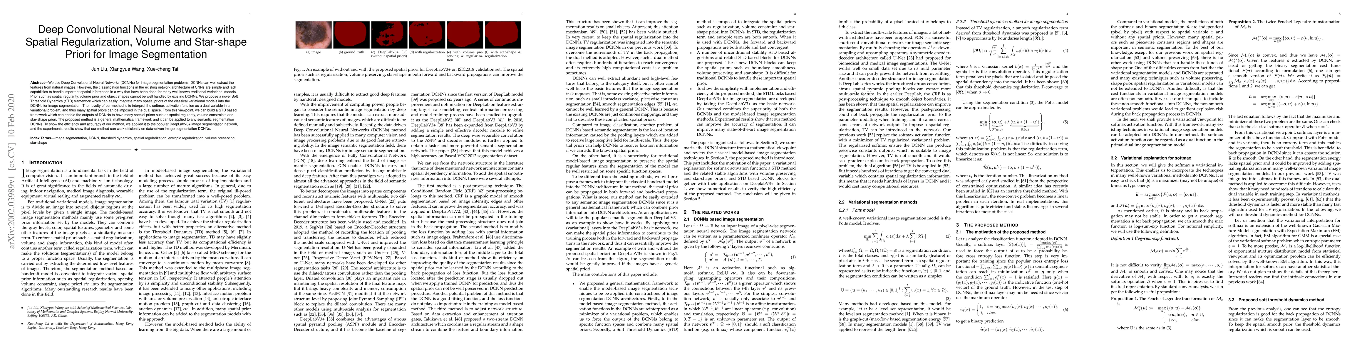 This paper proposes a Soft Threshold Dynamics (STD) framework to enhance Deep Convolutional Neural Networks (DCNNs) for image segmentation by integrating spatial priors like spatial regularity, volume constraints, and star-shape priors. The method reinterprets the softmax activation function as a dual variable, enabling the incorporation of these priors, and is demonstrated to improve segmentation accuracy when applied to the DeepLabV3+ network.