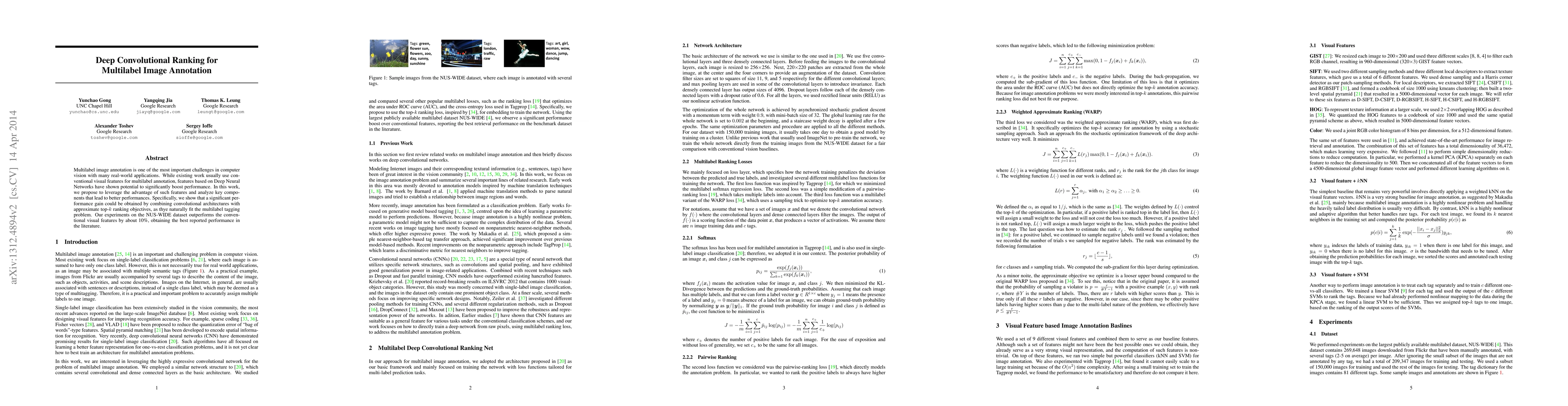 This paper proposes a deep convolutional ranking approach for multilabel image annotation, demonstrating that combining convolutional architectures with approximate top-$k$ ranking objectives significantly outperforms conventional visual features, achieving a 10% improvement on the NUS-WIDE dataset.