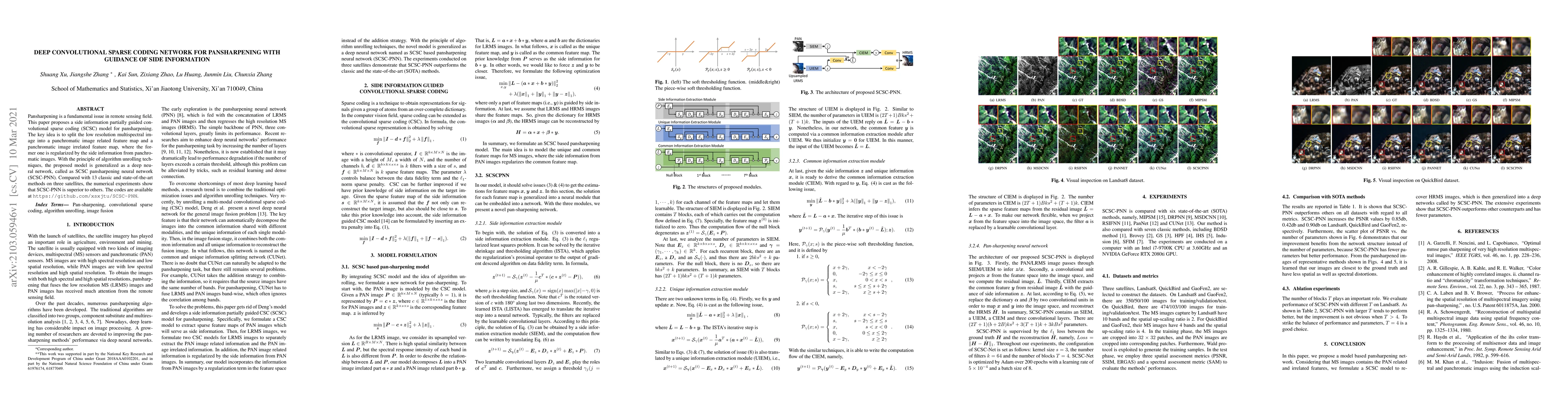 This paper introduces a deep convolutional sparse coding network, the SCSC-PNN, for pansharpening using side information. The model splits low-resolution multispectral images into feature maps, one regularized with panchromatic side information, and outperforms 13 other methods in experiments.