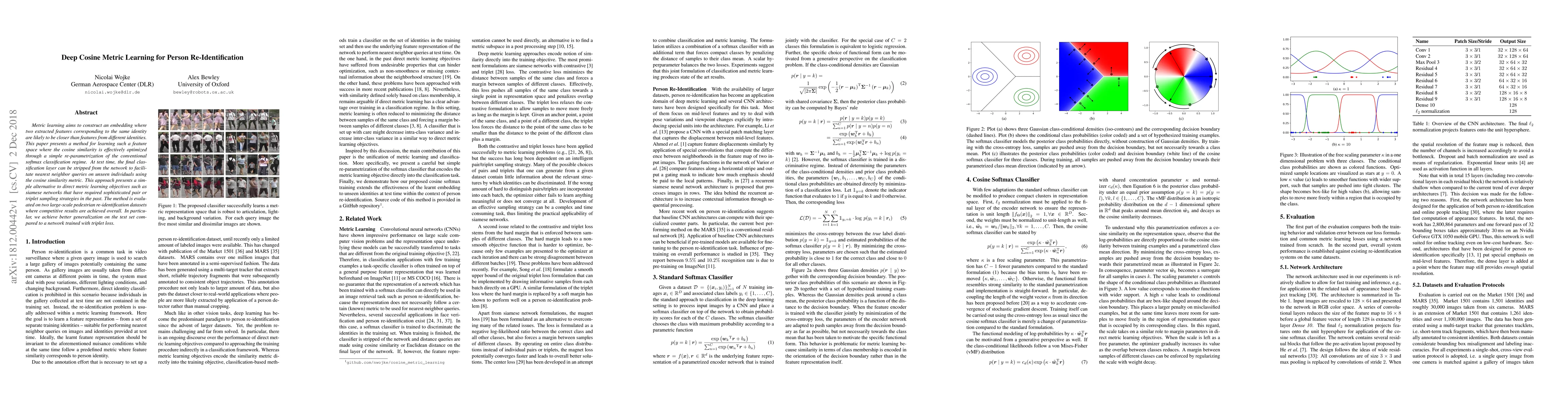 Metric learning aims to construct an embedding where two extracted features corresponding to the same identity are likely to be closer than features from different identities. This paper presents a method for learning such a feature space where the cosine similarity is effectively optimized through a simple re-parametrization of the conventional softmax classification regime. At test time, the final classification layer can be stripped from the network to facilitate nearest neighbor queries on unseen individuals using the cosine similarity metric. This approach presents a simple alternative to direct metric learning objectives such as siamese networks that have required sophisticated pair or triplet sampling strategies in the past. The method is evaluated on two large-scale pedestrian re-identification datasets where competitive results are achieved overall. In particular, we achieve better generalization on the test set compared to a network trained with triplet loss.