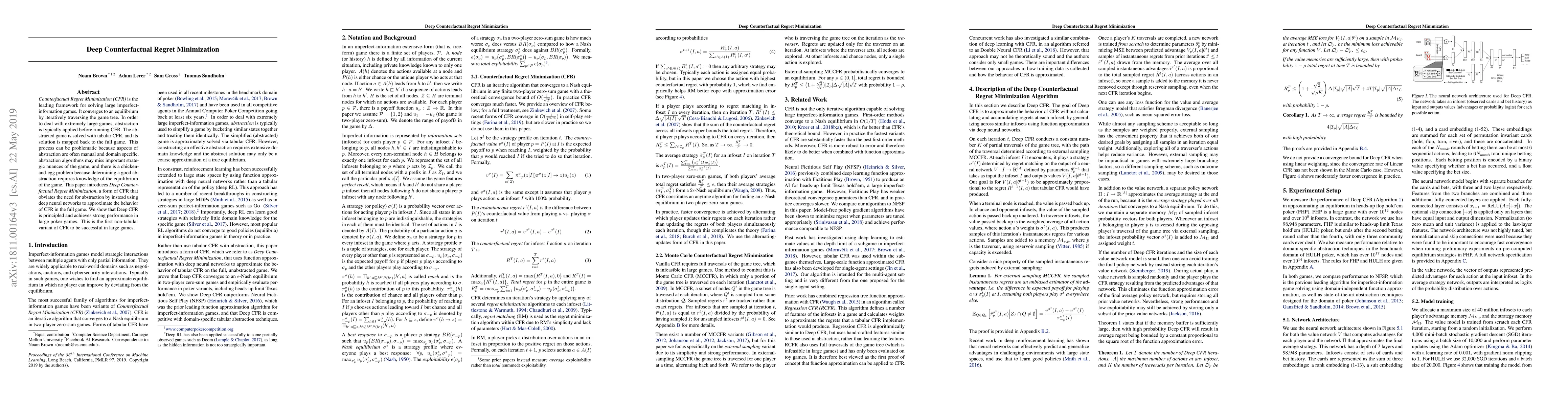 This paper introduces Deep Counterfactual Regret Minimization (Deep CFR), a novel approach that replaces abstraction with deep neural networks to approximate CFR in large imperfect-information games, demonstrating strong performance in large poker games. This method eliminates the need for manual abstraction, addressing strategic nuances and the chicken-and-egg problem inherent in traditional CFR.