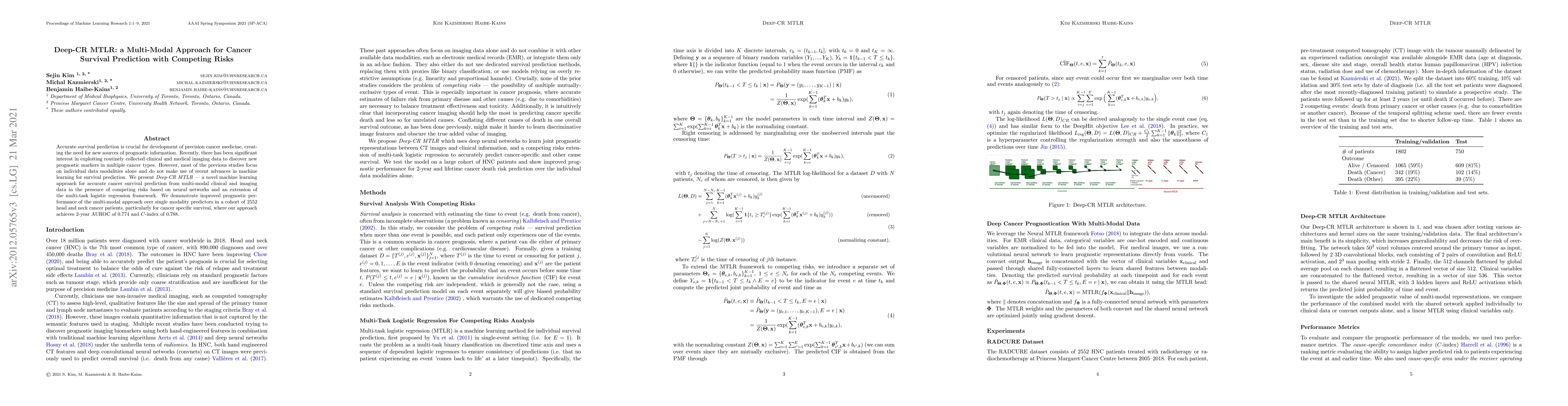 Deep-CR MTLR is a novel machine learning approach that combines clinical and imaging data to predict cancer survival, addressing competing risks. It demonstrates superior prognostic performance over single modality predictors, achieving a 2-year AUROC of 0.774 and a $C$-index of 0.788 in a cohort of 2552 head and neck cancer patients.