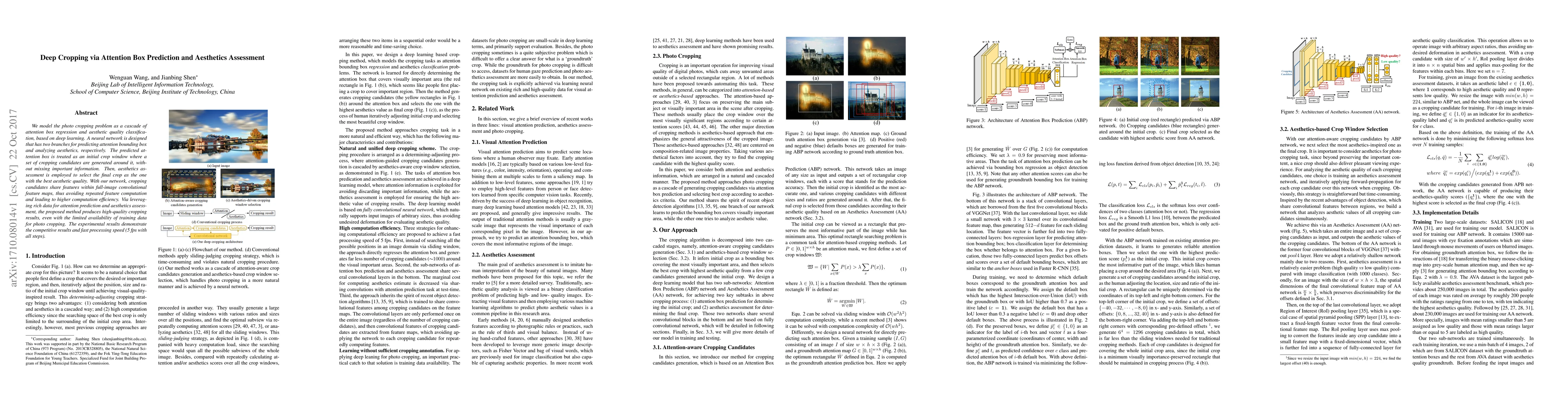 This paper proposes a deep learning method for photo cropping that uses a neural network with two branches: one for predicting attention boxes and another for assessing aesthetic quality. The method efficiently generates and selects high-quality cropping candidates, achieving competitive results and fast processing speed.