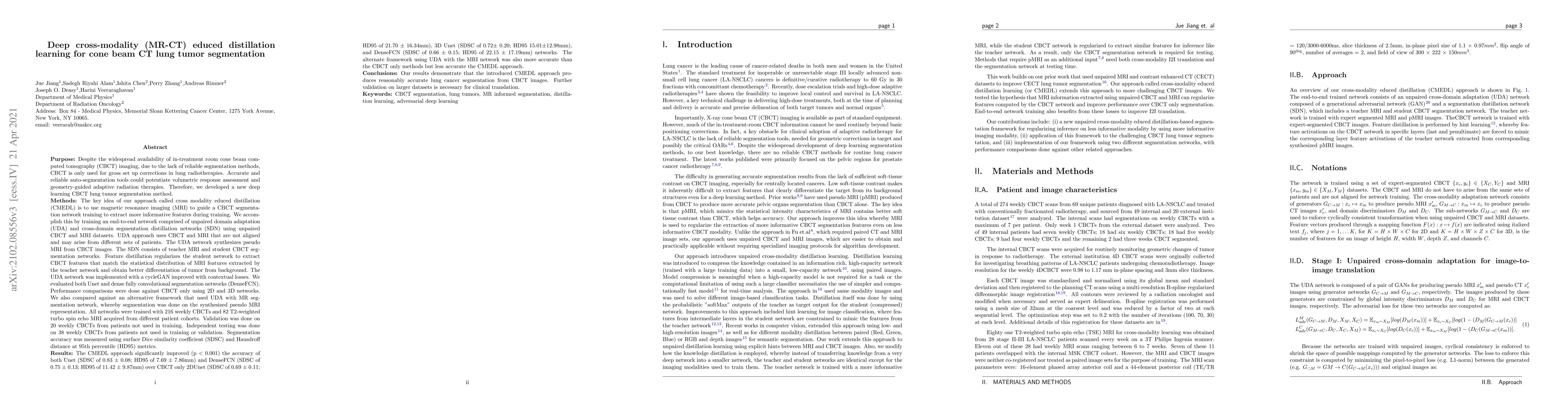 This paper introduces a deep learning method called cross modality educed distillation (CMEDL) for segmenting lung tumors in cone beam CT (CBCT) images using MRI guidance. The proposed method employs unpaired domain adaptation and cross-domain segmentation distillation to improve feature extraction and tumor differentiation, achieving better segmentation accuracy compared to alternative methods.
