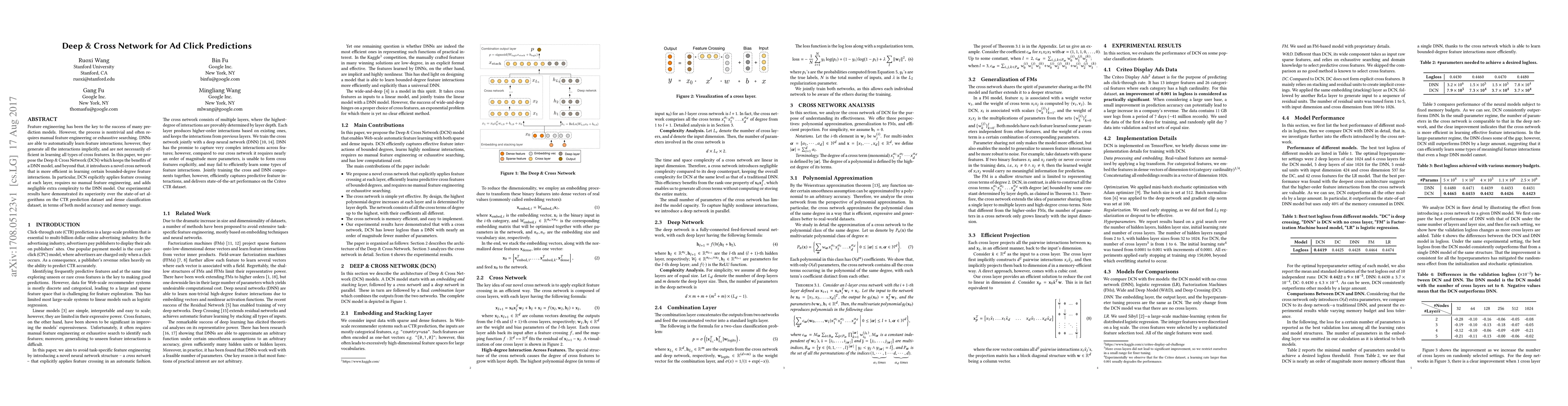 The Deep & Cross Network (DCN) is proposed to improve ad click prediction by combining Deep Neural Networks (DNNs) with a novel Cross Network. DCN explicitly learns feature interactions, eliminating the need for manual feature engineering and adding minimal computational cost. It outperforms existing methods in both accuracy and memory efficiency on click-through rate (CTR) prediction and dense classification tasks.
