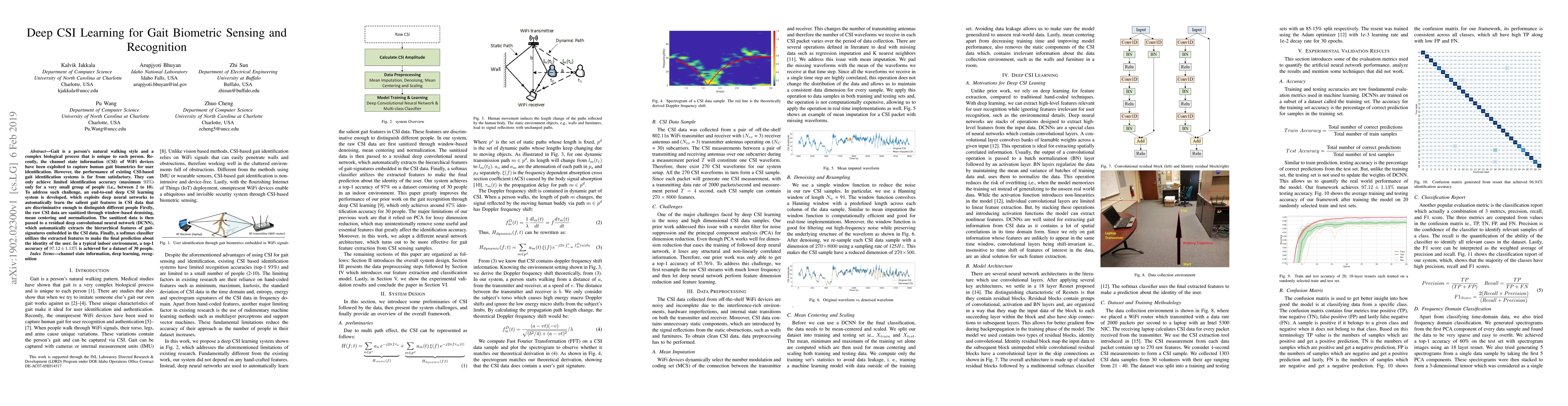 This paper proposes a deep CSI learning system using deep neural networks to enhance gait biometric sensing and recognition from WiFi channel state information. The system achieves a top-1 accuracy of 97.12% ± 1.13% for identifying 30 individuals in an indoor environment.