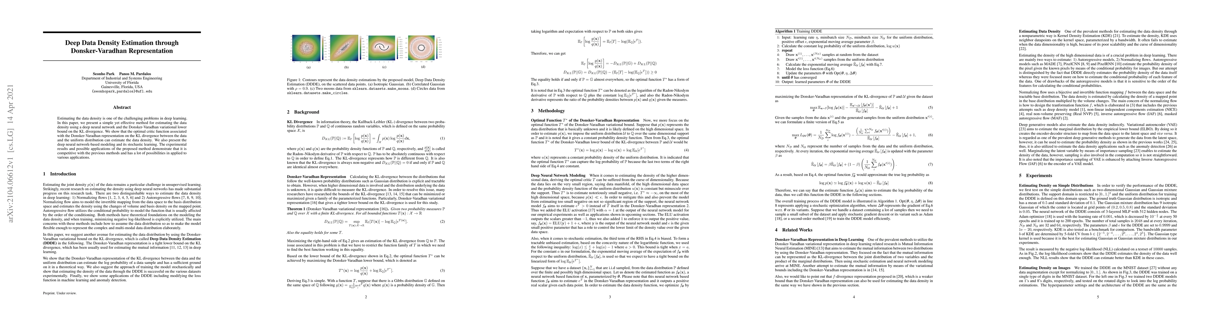 This paper proposes a novel method for estimating data density using deep neural networks and the Donsker-Varadhan variational lower bound on KL divergence. The method leverages the optimal critic function from the Donsker-Varadhan representation to achieve effective density estimation, demonstrating competitive performance against previous techniques.