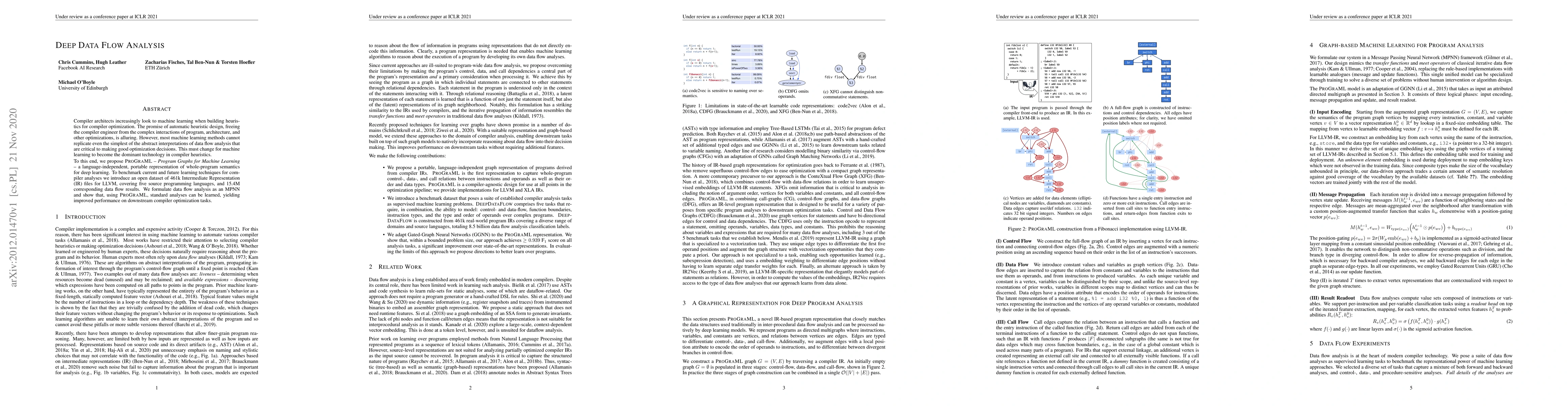 This paper proposes ProGraML, a language-independent representation for deep learning to replicate data flow analysis in compiler optimization. It introduces an open dataset for benchmarking and demonstrates improved performance on compiler tasks using machine learning techniques.
