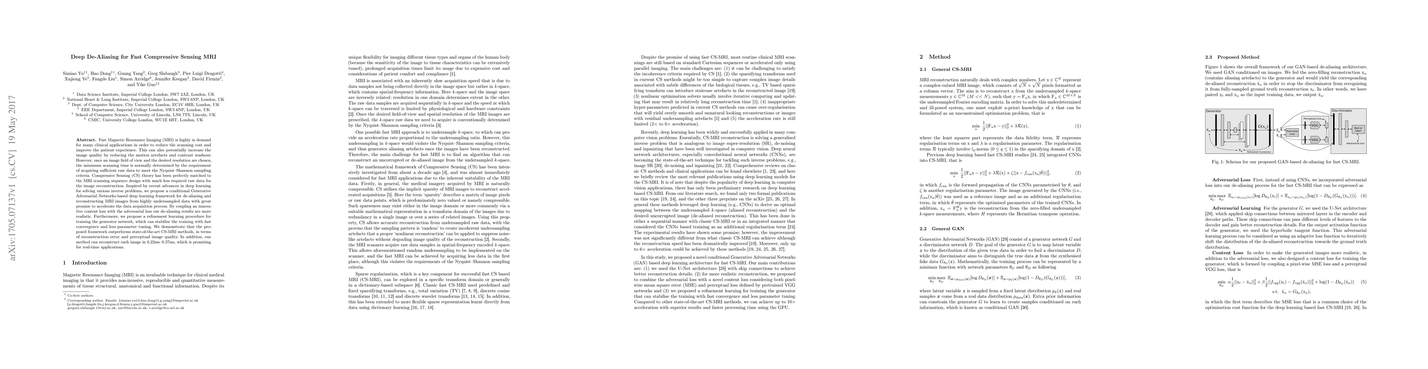 Fast Magnetic Resonance Imaging (MRI) is highly in demand for many clinical applications in order to reduce the scanning cost and improve the patient experience. This can also potentially increase the image quality by reducing the motion artefacts and contrast washout. However, once an image field of view and the desired resolution are chosen, the minimum scanning time is normally determined by the requirement of acquiring sufficient raw data to meet the Nyquist-Shannon sampling criteria. Compressive Sensing (CS) theory has been perfectly matched to the MRI scanning sequence design with much less required raw data for the image reconstruction. Inspired by recent advances in deep learning for solving various inverse problems, we propose a conditional Generative Adversarial Networks-based deep learning framework for de-aliasing and reconstructing MRI images from highly undersampled data with great promise to accelerate the data acquisition process. By coupling an innovative content loss with the adversarial loss our de-aliasing results are more realistic. Furthermore, we propose a refinement learning procedure for training the generator network, which can stabilise the training with fast convergence and less parameter tuning. We demonstrate that the proposed framework outperforms state-of-the-art CS-MRI methods, in terms of reconstruction error and perceptual image quality. In addition, our method can reconstruct each image in 0.22ms--0.37ms, which is promising for real-time applications.