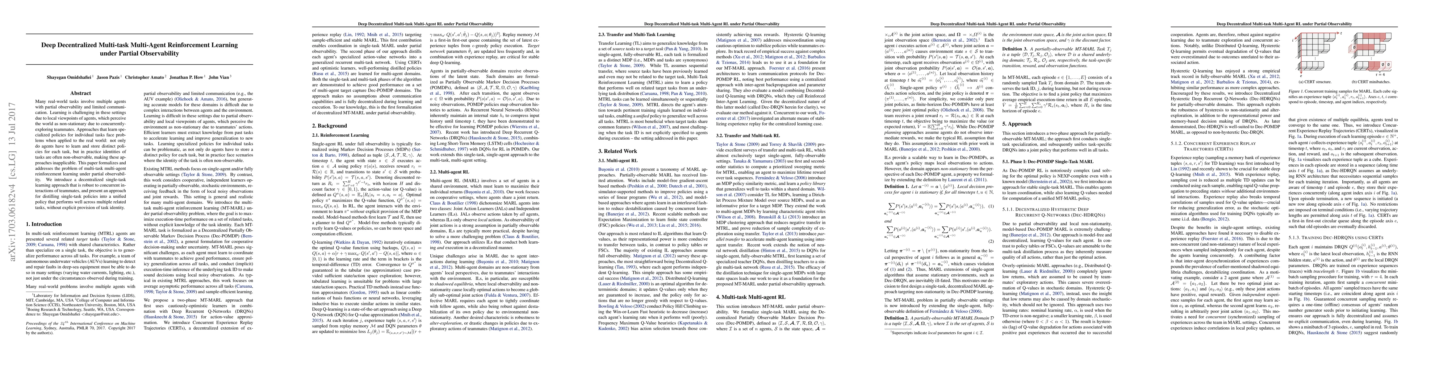 This paper addresses multi-task multi-agent reinforcement learning under partial observability, introducing a decentralized learning method robust to teammates' concurrent interactions. It proposes a technique to distill single-task policies into a unified policy that performs well across related tasks without needing explicit task identity.