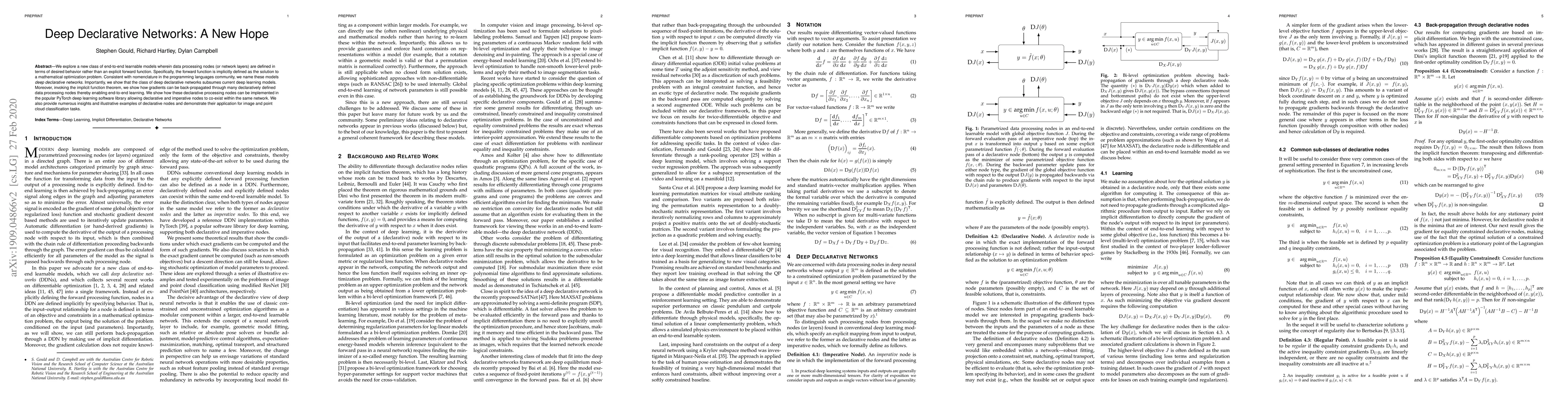 Deep declarative networks define data processing nodes based on desired behavior rather than explicit functions, implicitly solving optimization problems. They subsume current deep learning models and enable end-to-end learning through gradient back-propagation, demonstrated in PyTorch for image and point cloud classification tasks.