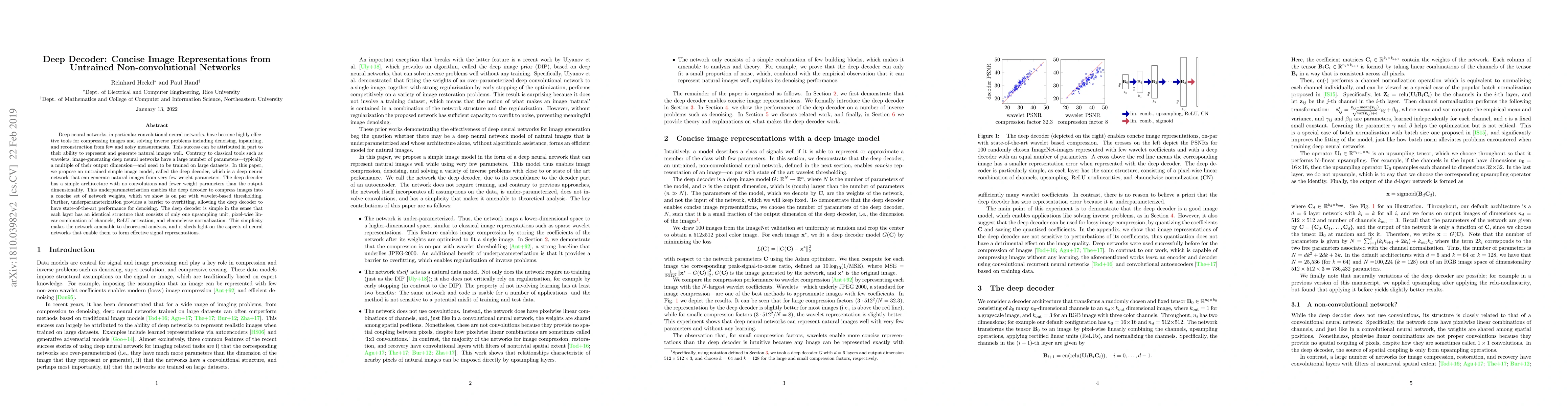 This paper introduces the deep decoder, a simple, untrained neural network model with no convolutions, which generates natural images using fewer parameters than the output dimension. The underparameterized architecture enables effective image compression and state-of-the-art performance in denoising, comparable to wavelet-based methods.