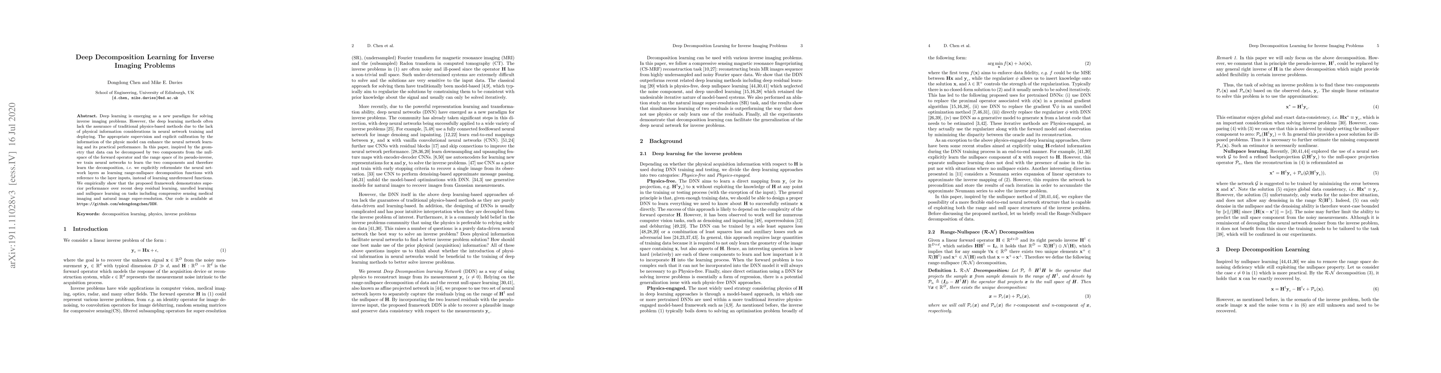 This paper proposes deep decomposition learning to solve inverse imaging problems by reformulating neural networks to explicitly learn the range-nullspace decomposition of data, thus incorporating physical model information. The approach outperforms recent deep learning methods on tasks like compressive sensing medical imaging and super-resolution.
