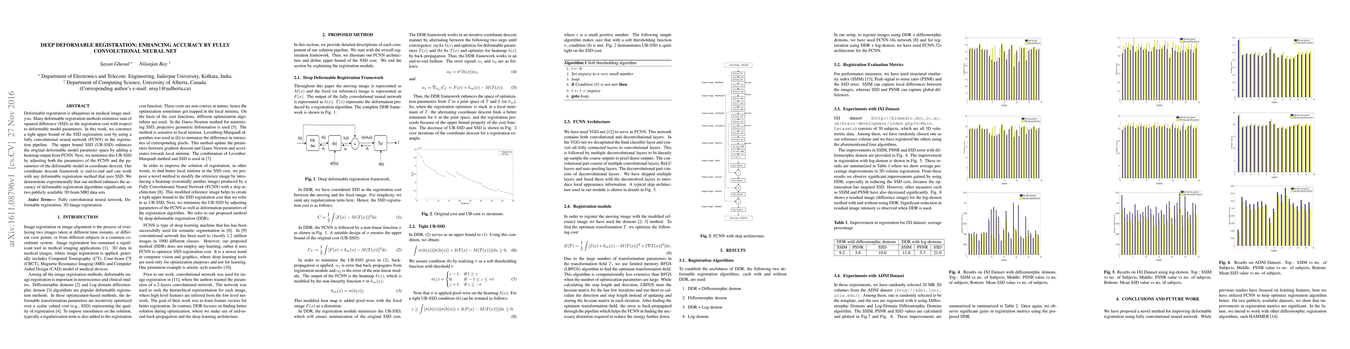 This paper proposes a method to enhance the accuracy of deformable registration in medical image analysis by integrating a fully convolutional neural network (FCNN) to construct a tight upper bound of the sum of squared difference (SSD). The method improves registration accuracy by minimizing the enhanced SSD through a coordinate descent framework. Experimental results show significant improvements on 3D brain MRI datasets.
