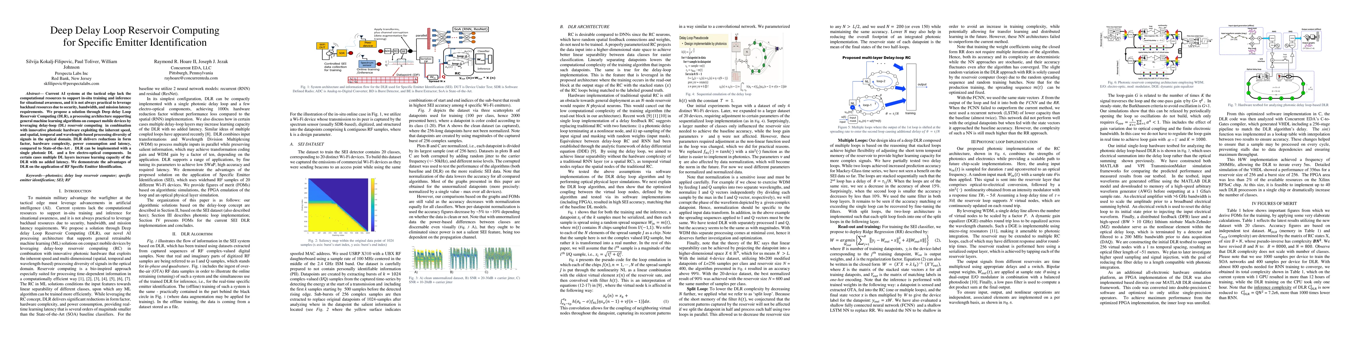 Current AI systems at the tactical edge lack the computational resources to support in-situ training and inference for situational awareness, and it is not always practical to leverage backhaul resources due to security, bandwidth, and mission latency requirements. We propose a solution through Deep delay Loop Reservoir Computing (DLR), a processing architecture supporting general machine learning algorithms on compact mobile devices by leveraging delay-loop (DL) reservoir computing in combination with innovative photonic hardware exploiting the inherent speed, and spatial, temporal and wavelength-based processing diversity of signals in the optical domain. DLR delivers reductions in form factor, hardware complexity, power consumption and latency, compared to State-of-the-Art . DLR can be implemented with a single photonic DL and a few electro-optical components. In certain cases multiple DL layers increase learning capacity of the DLR with no added latency. We demonstrate the advantages of DLR on the application of RF Specific Emitter Identification.
