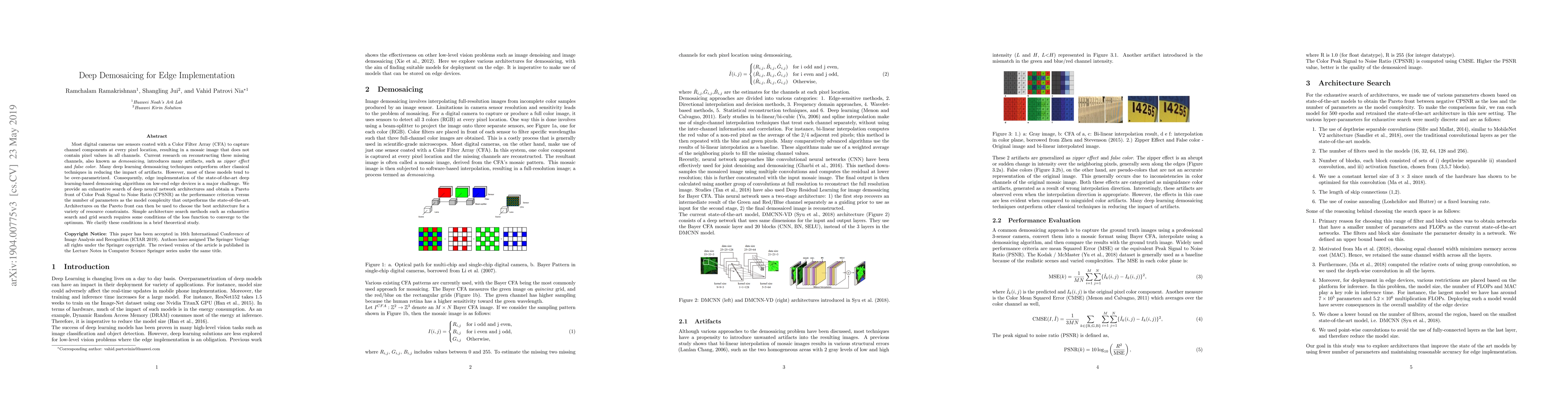 This paper explores deep learning-based demosaicing techniques to reconstruct missing color channels in mosaic images from digital cameras, addressing artifacts like the zipper effect. It identifies the challenge of implementing these models on low-end edge devices due to their high parameter count, and proposes an exhaustive search to find optimal architectures balancing performance and complexity.