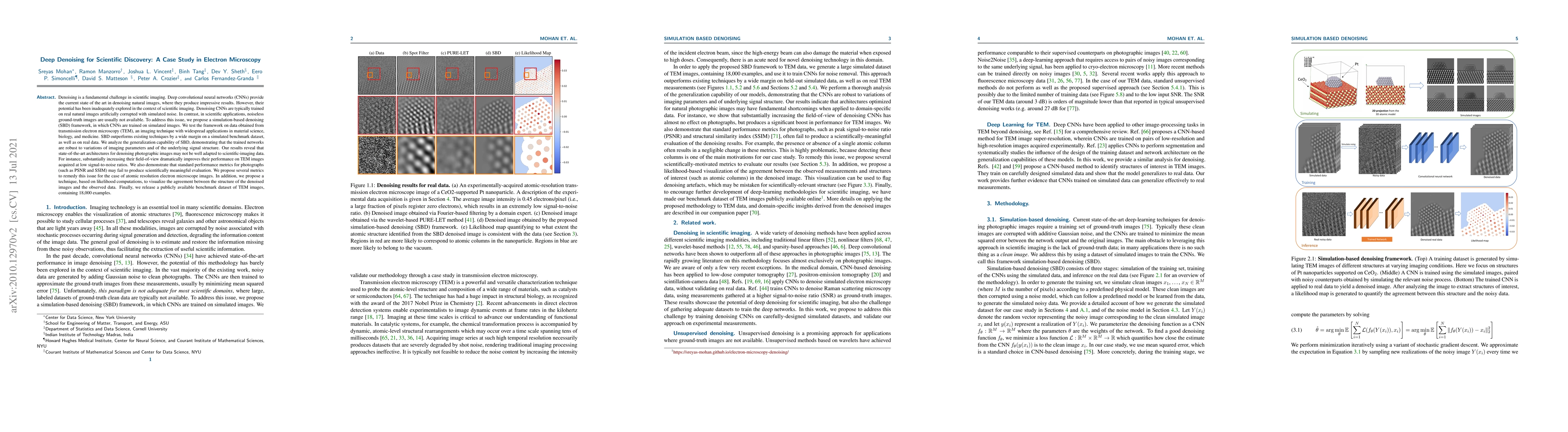 Denoising is a fundamental challenge in scientific imaging. Deep convolutional neural networks (CNNs) provide the current state of the art in denoising natural images, where they produce impressive results. However, their potential has barely been explored in the context of scientific imaging. Denoising CNNs are typically trained on real natural images artificially corrupted with simulated noise. In contrast, in scientific applications, noiseless ground-truth images are usually not available. To address this issue, we propose a simulation-based denoising (SBD) framework, in which CNNs are trained on simulated images. We test the framework on data obtained from transmission electron microscopy (TEM), an imaging technique with widespread applications in material science, biology, and medicine. SBD outperforms existing techniques by a wide margin on a simulated benchmark dataset, as well as on real data. Apart from the denoised images, SBD generates likelihood maps to visualize the agreement between the structure of the denoised image and the observed data. Our results reveal shortcomings of state-of-the-art denoising architectures, such as their small field-of-view: substantially increasing the field-of-view of the CNNs allows them to exploit non-local periodic patterns in the data, which is crucial at high noise levels. In addition, we analyze the generalization capability of SBD, demonstrating that the trained networks are robust to variations of imaging parameters and of the underlying signal structure. Finally, we release the first publicly available benchmark dataset of TEM images, containing 18,000 examples.