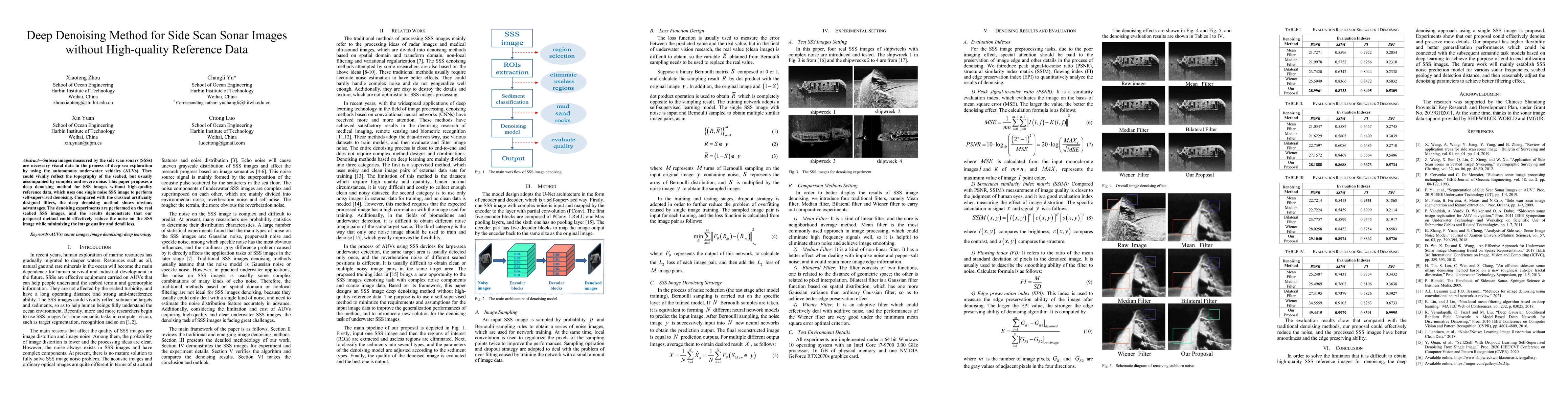 This research introduces a deep learning method to denoise side scan sonar (SSS) images used in deep-sea exploration by AUVs, which effectively reduces noise without high-quality reference data, outperforming traditional filters and preserving image details and quality.