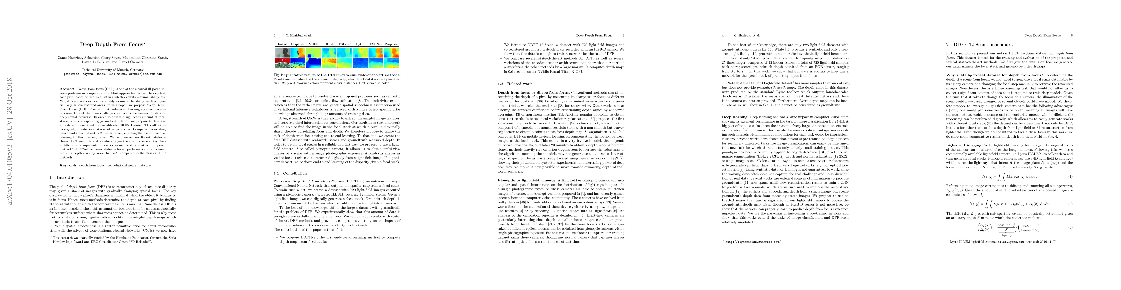 This paper introduces `Deep Depth From Focus (DDFF)', an end-to-end learning approach for solving the depth from focus problem, leveraging a large dataset created from a light-field camera and an RGB-D sensor. The proposed `DDFFNet' achieves state-of-the-art performance, reducing depth error by over 75% compared to traditional methods.