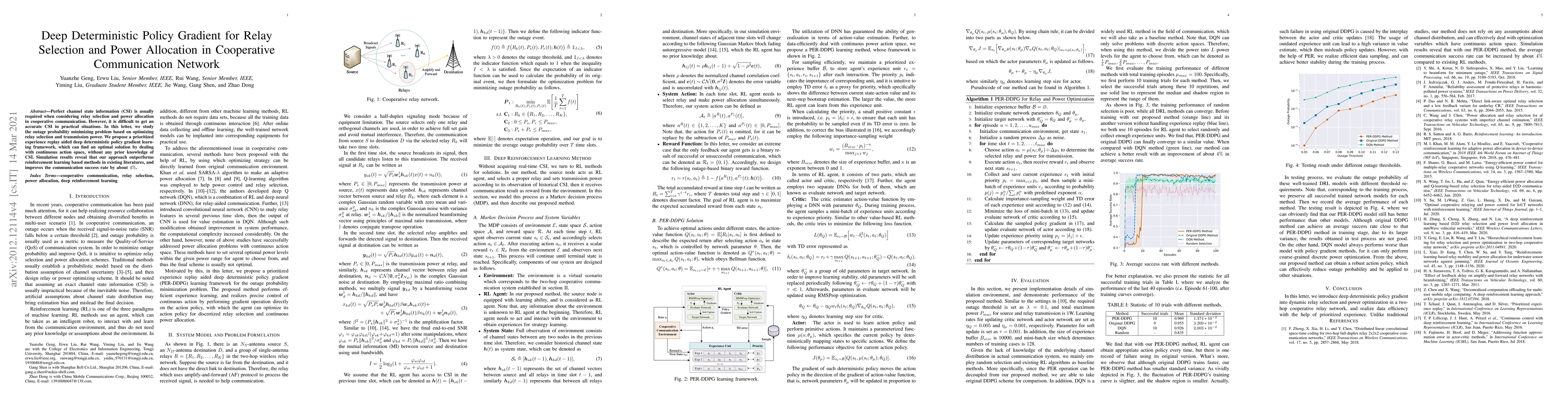Deep deterministic policy gradient is used to optimize relay selection and power allocation in a two-hop cooperative relay network.