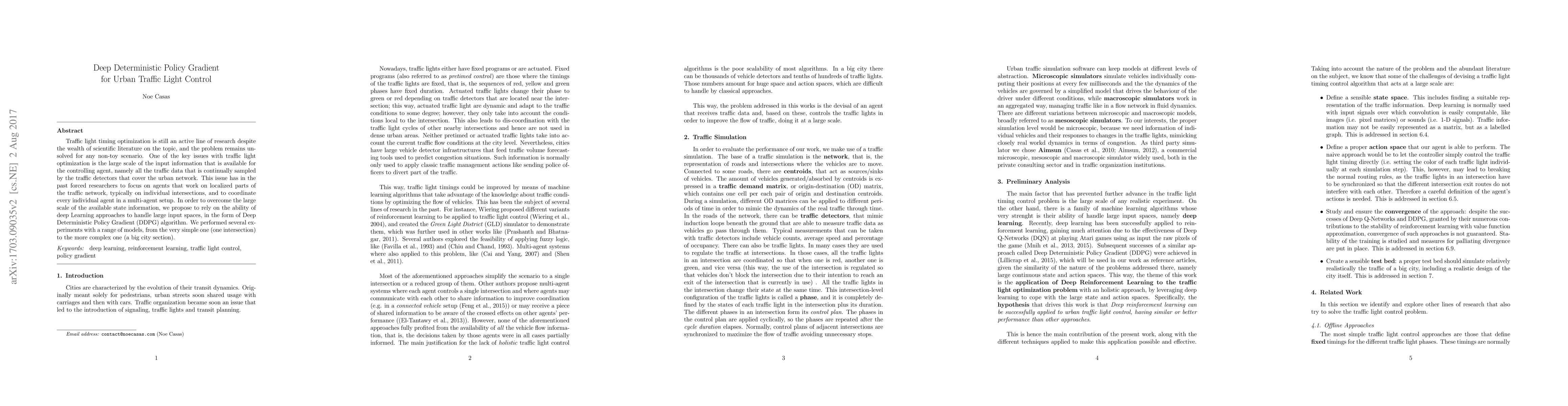 Traffic light timing optimization is still an active line of research despite the wealth of scientific literature on the topic, and the problem remains unsolved for any non-toy scenario. One of the key issues with traffic light optimization is the large scale of the input information that is available for the controlling agent, namely all the traffic data that is continually sampled by the traffic detectors that cover the urban network. This issue has in the past forced researchers to focus on agents that work on localized parts of the traffic network, typically on individual intersections, and to coordinate every individual agent in a multi-agent setup. In order to overcome the large scale of the available state information, we propose to rely on the ability of deep Learning approaches to handle large input spaces, in the form of Deep Deterministic Policy Gradient (DDPG) algorithm. We performed several experiments with a range of models, from the very simple one (one intersection) to the more complex one (a big city section).
