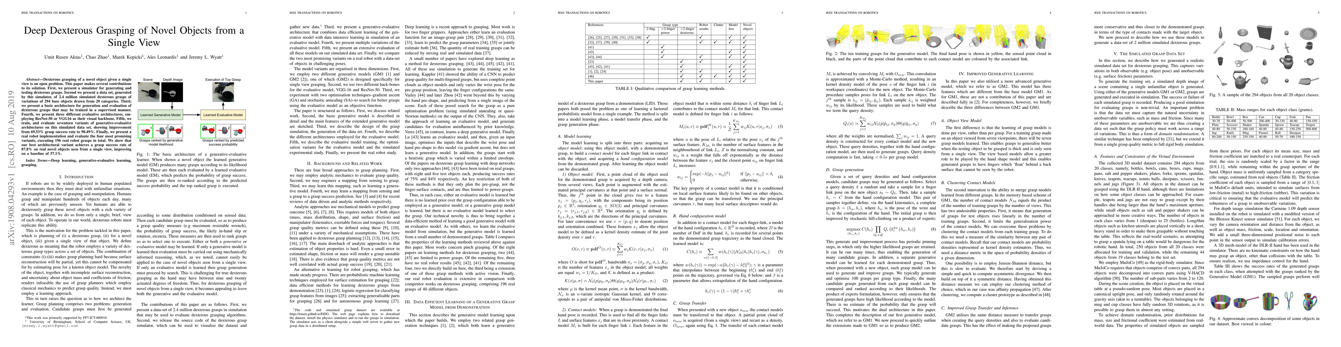 This paper develops a simulator and dataset for dexterous grasping of novel objects from a single view, introduces a generative-evaluative architecture, and trains seventeen variants achieving a 90.49% success rate on simulated data. The best variant demonstrates an 87.8% success rate on real robot grasps, significantly improving upon a baseline of 57.1%.
