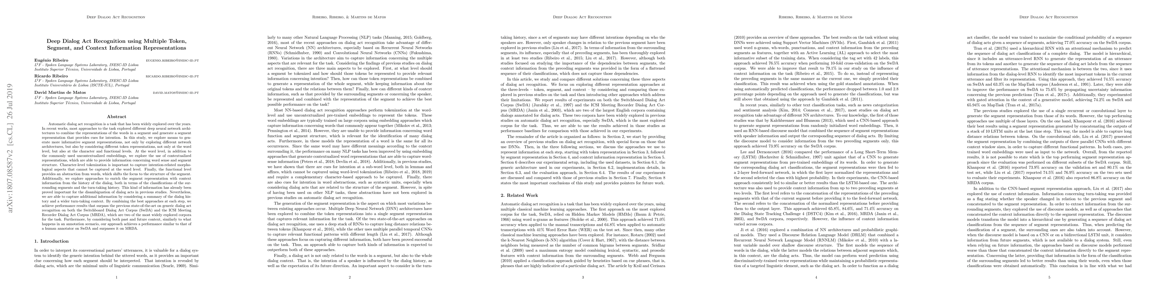 Dialog act (DA) recognition is a task that has been widely explored over the years. Recently, most approaches to the task explored different DNN architectures to combine the representations of the words in a segment and generate a segment representation that provides cues for intention. In this study, we explore means to generate more informative segment representations, not only by exploring different network architectures, but also by considering different token representations, not only at the word level, but also at the character and functional levels. At the word level, in addition to the commonly used uncontextualized embeddings, we explore the use of contextualized representations, which provide information concerning word sense and segment structure. Character-level tokenization is important to capture intention-related morphological aspects that cannot be captured at the word level. Finally, the functional level provides an abstraction from words, which shifts the focus to the structure of the segment. We also explore approaches to enrich the segment representation with context information from the history of the dialog, both in terms of the classifications of the surrounding segments and the turn-taking history. This kind of information has already been proved important for the disambiguation of DAs in previous studies. Nevertheless, we are able to capture additional information by considering a summary of the dialog history and a wider turn-taking context. By combining the best approaches at each step, we achieve results that surpass the previous state-of-the-art on generic DA recognition on both SwDA and MRDA, two of the most widely explored corpora for the task. Furthermore, by considering both past and future context, simulating annotation scenario, our approach achieves a performance similar to that of a human annotator on SwDA and surpasses it on MRDA.
