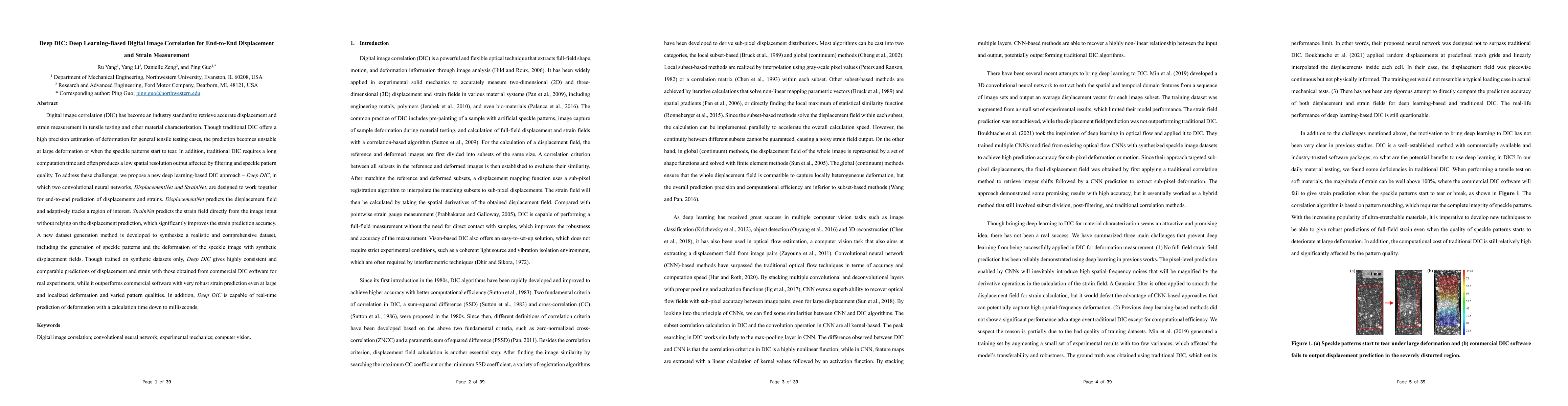 This paper proposes Deep DIC, a deep learning-based approach using convolutional neural networks to predict displacement and strain in material testing, offering robust performance even at large deformations and varied pattern qualities. It outperforms traditional DIC in real-time prediction and strain accuracy.