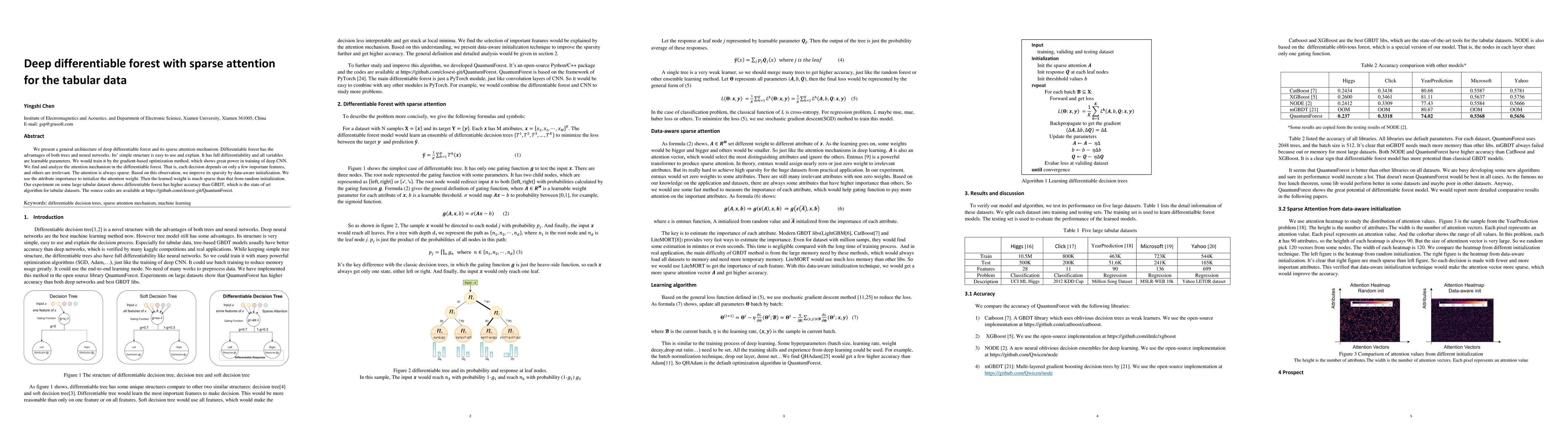 This paper introduces a deep differentiable forest architecture combining tree and neural network benefits, featuring a simple binary tree structure and full differentiability. The proposed sparse attention mechanism enhances model efficiency by focusing on important features, leading to higher accuracy on tabular datasets compared to gradient-boosted decision trees (GBDT).