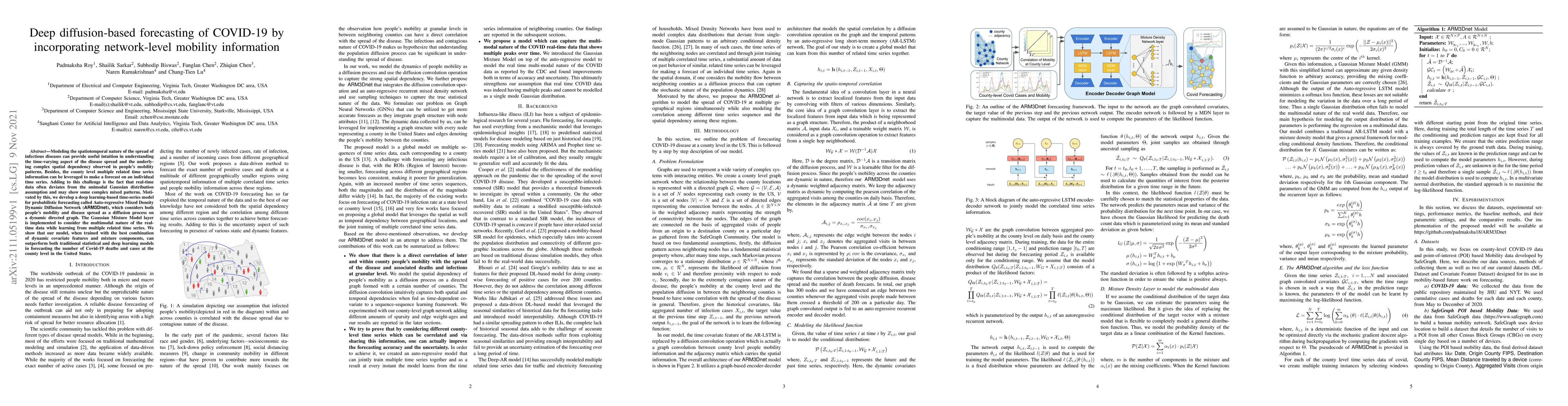 Modeling the spatiotemporal nature of the spread of infectious diseases can provide useful intuition in understanding the time-varying aspect of the disease spread and the underlying complex spatial dependency observed in people's mobility patterns. Besides, the county level multiple related time series information can be leveraged to make a forecast on an individual time series. Adding to this challenge is the fact that real-time data often deviates from the unimodal Gaussian distribution assumption and may show some complex mixed patterns. Motivated by this, we develop a deep learning-based time-series model for probabilistic forecasting called Auto-regressive Mixed Density Dynamic Diffusion Network(ARM3Dnet), which considers both people's mobility and disease spread as a diffusion process on a dynamic directed graph. The Gaussian Mixture Model layer is implemented to consider the multimodal nature of the real-time data while learning from multiple related time series. We show that our model, when trained with the best combination of dynamic covariate features and mixture components, can outperform both traditional statistical and deep learning models in forecasting the number of Covid-19 deaths and cases at the county level in the United States.