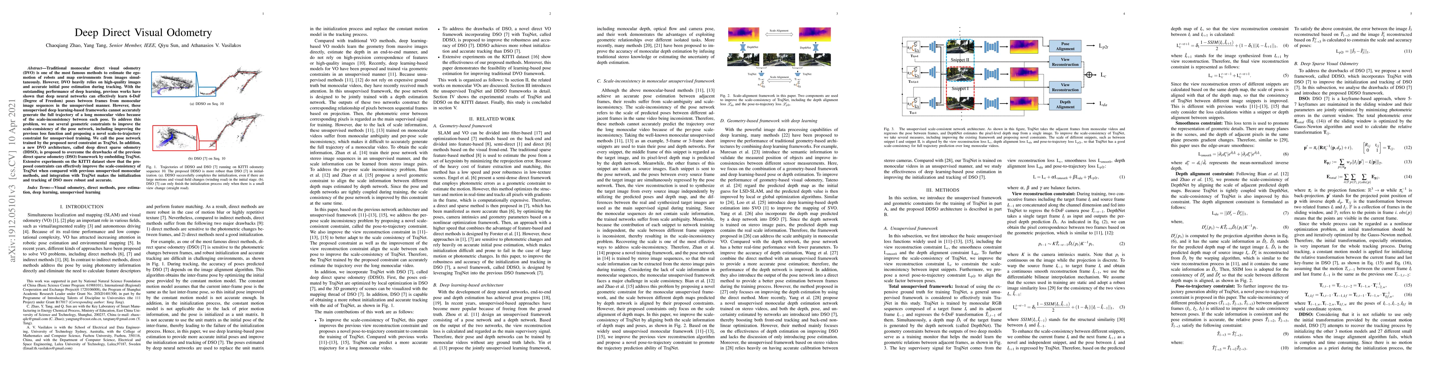 Traditional monocular direct visual odometry (DVO) is one of the most famous methods to estimate the ego-motion of robots and map environments from images simultaneously. However, DVO heavily relies on high-quality images and accurate initial pose estimation during tracking. With the outstanding performance of deep learning, previous works have shown that deep neural networks can effectively learn 6-DoF (Degree of Freedom) poses between frames from monocular image sequences in the unsupervised manner. However, these unsupervised deep learning-based frameworks cannot accurately generate the full trajectory of a long monocular video because of the scale-inconsistency between each pose. To address this problem, we use several geometric constraints to improve the scale-consistency of the pose network, including improving the previous loss function and proposing a novel scale-to-trajectory constraint for unsupervised training. We call the pose network trained by the proposed novel constraint as TrajNet. In addition, a new DVO architecture, called deep direct sparse odometry (DDSO), is proposed to overcome the drawbacks of the previous direct sparse odometry (DSO) framework by embedding TrajNet. Extensive experiments on the KITTI dataset show that the proposed constraints can effectively improve the scale-consistency of TrajNet when compared with previous unsupervised monocular methods, and integration with TrajNet makes the initialization and tracking of DSO more robust and accurate.