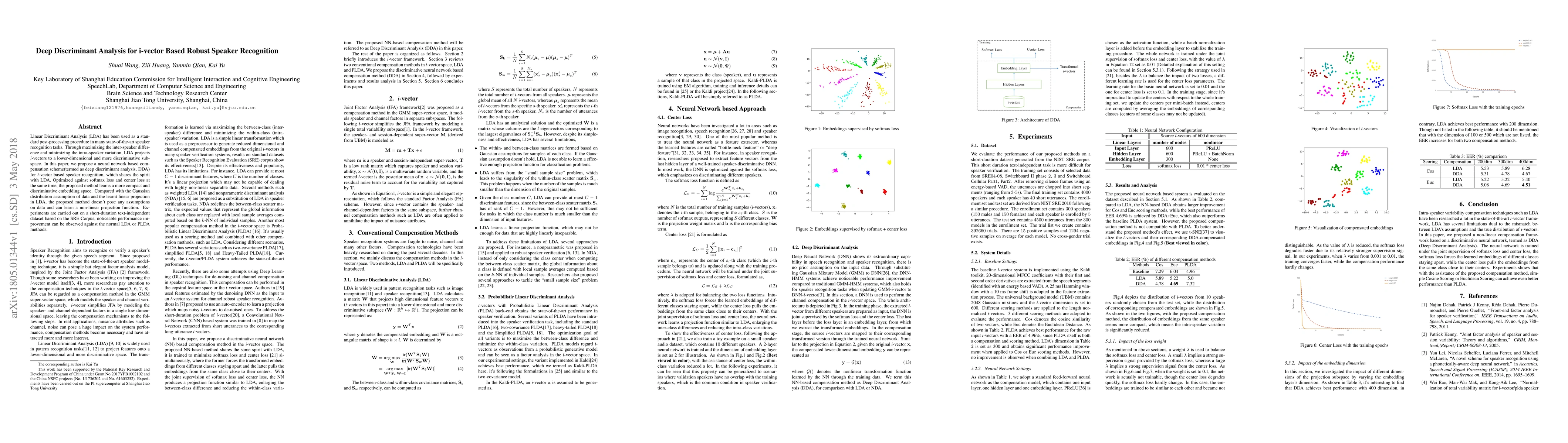 Linear Discriminant Analysis (LDA) has been used as a standard post-processing procedure in many state-of-the-art speaker recognition tasks. Through maximizing the inter-speaker difference and minimizing the intra-speaker variation, LDA projects i-vectors to a lower-dimensional and more discriminative sub-space. In this paper, we propose a neural network based compensation scheme(termed as deep discriminant analysis, DDA) for i-vector based speaker recognition, which shares the spirit with LDA. Optimized against softmax loss and center loss at the same time, the proposed method learns a more compact and discriminative embedding space. Compared with the Gaussian distribution assumption of data and the learnt linear projection in LDA, the proposed method doesn't pose any assumptions on data and can learn a non-linear projection function. Experiments are carried out on a short-duration text-independent dataset based on the SRE Corpus, noticeable performance improvement can be observed against the normal LDA or PLDA methods.