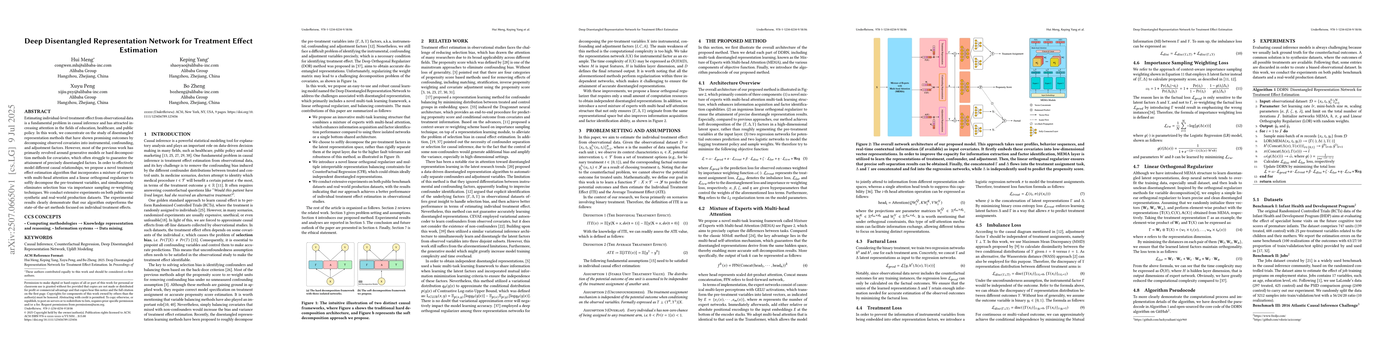 Estimating individual-level treatment effect from observational data is a fundamental problem in causal inference and has attracted increasing attention in the fields of education, healthcare, and public policy.In this work, we concentrate on the study of disentangled representation methods that have shown promising outcomes by decomposing observed covariates into instrumental, confounding, and adjustment factors. However, most of the previous work has primarily revolved around generative models or hard decomposition methods for covariates, which often struggle to guarantee the attainment of precisely disentangled factors. In order to effectively model different causal relationships, we propose a novel treatment effect estimation algorithm that incorporates a mixture of experts with multi-head attention and a linear orthogonal regularizer to softly decompose the pre-treatment variables, and simultaneously eliminates selection bias via importance sampling re-weighting techniques. We conduct extensive experiments on both public semi-synthetic and real-world production datasets. The experimental results clearly demonstrate that our algorithm outperforms the state-of-the-art methods focused on individual treatment effects.