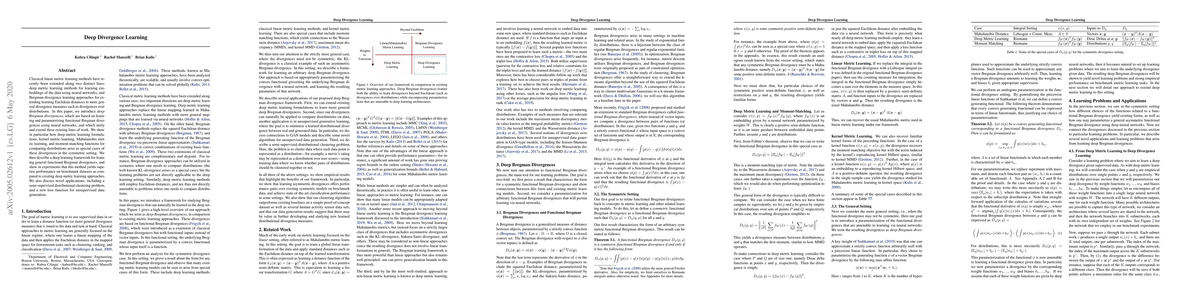 This paper proposes deep Bregman divergences, leveraging neural networks to parameterize functional Bregman divergences, thereby unifying and extending classical linear metric learning methods. Experiments show improved performance on benchmark datasets and introduce novel applications like semi-supervised clustering and unsupervised data generation.