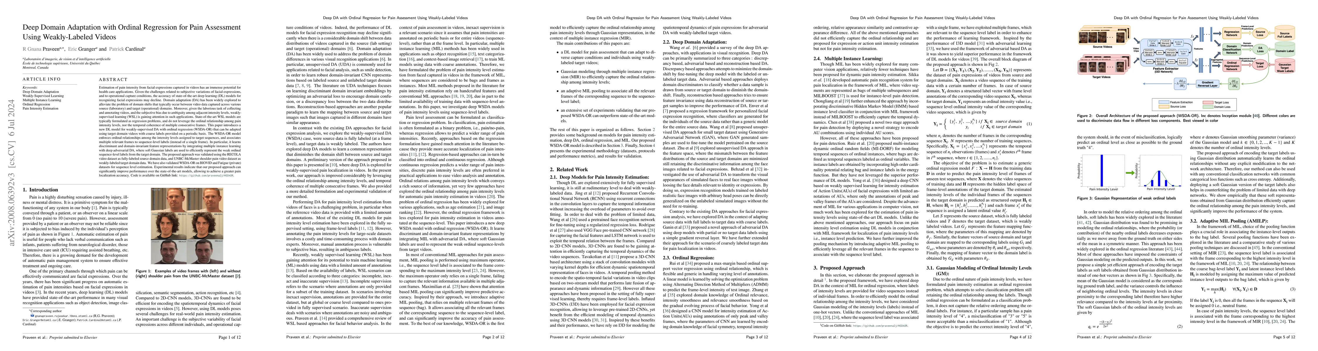 This paper proposes a deep learning model for domain adaptation in ordinal regression of pain intensity from facial expressions in weakly-labeled videos, integrating multiple instance learning with deep adversarial domain adaptation to enforce ordinal relationships and temporal coherence. The model was validated on several datasets, showing improved performance over state-of-the-art weakly-supervised methods.