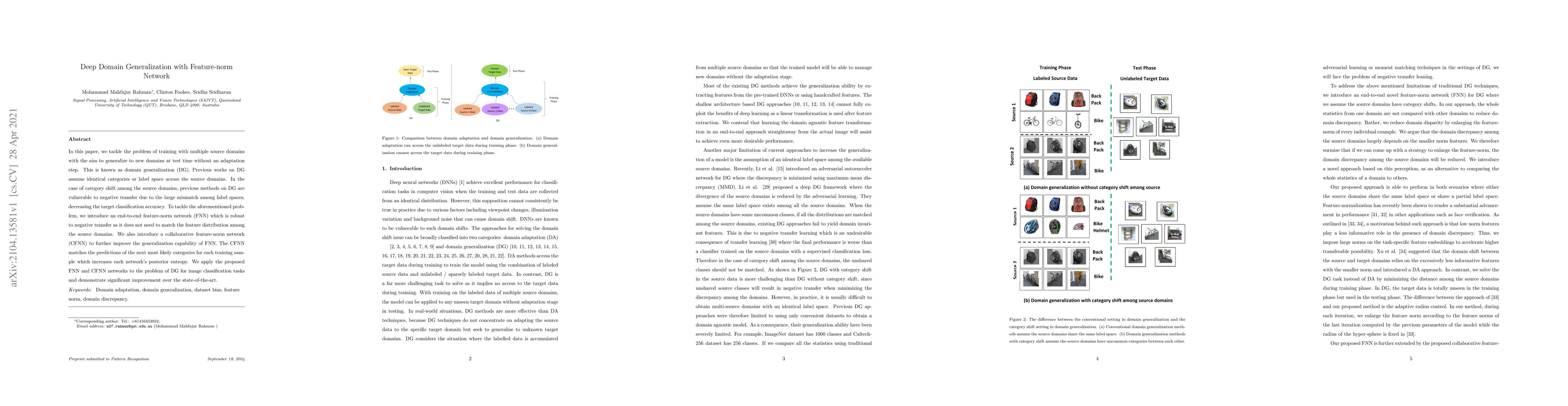 In this paper, we tackle the problem of training with multiple source domains with the aim to generalize to new domains at test time without an adaptation step. This is known as domain generalization (DG). Previous works on DG assume identical categories or label space across the source domains. In the case of category shift among the source domains, previous methods on DG are vulnerable to negative transfer due to the large mismatch among label spaces, decreasing the target classification accuracy. To tackle the aforementioned problem, we introduce an end-to-end feature-norm network (FNN) which is robust to negative transfer as it does not need to match the feature distribution among the source domains. We also introduce a collaborative feature-norm network (CFNN) to further improve the generalization capability of FNN. The CFNN matches the predictions of the next most likely categories for each training sample which increases each network's posterior entropy. We apply the proposed FNN and CFNN networks to the problem of DG for image classification tasks and demonstrate significant improvement over the state-of-the-art.