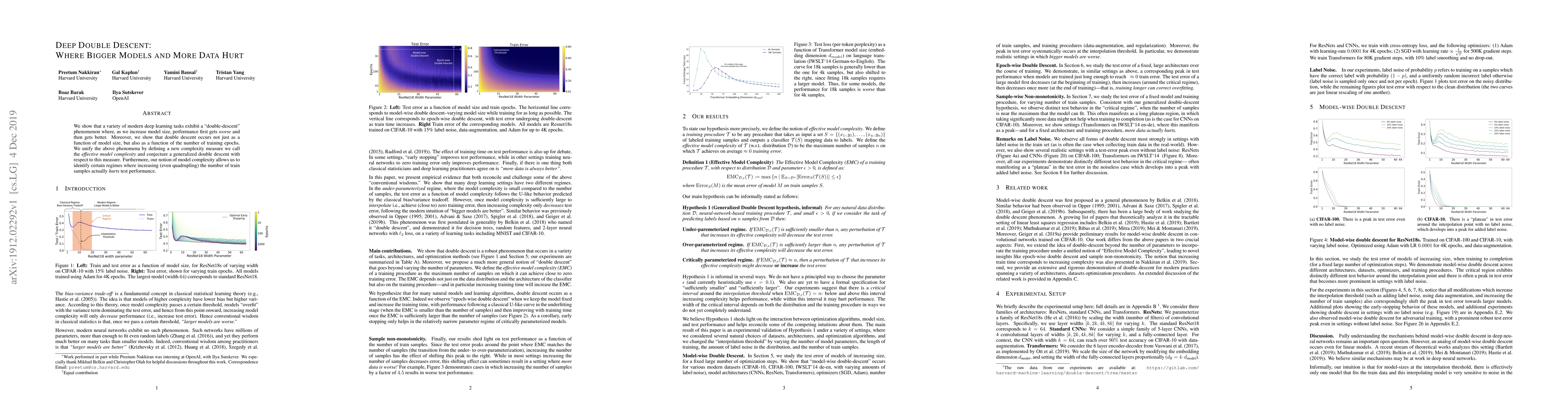 We show that a variety of modern deep learning tasks exhibit a "double-descent" phenomenon where, as we increase model size, performance first gets worse and then gets better. Moreover, we show that double descent occurs not just as a function of model size, but also as a function of the number of training epochs. We unify the above phenomena by defining a new complexity measure we call the effective model complexity and conjecture a generalized double descent with respect to this measure. Furthermore, our notion of model complexity allows us to identify certain regimes where increasing (even quadrupling) the number of train samples actually hurts test performance.