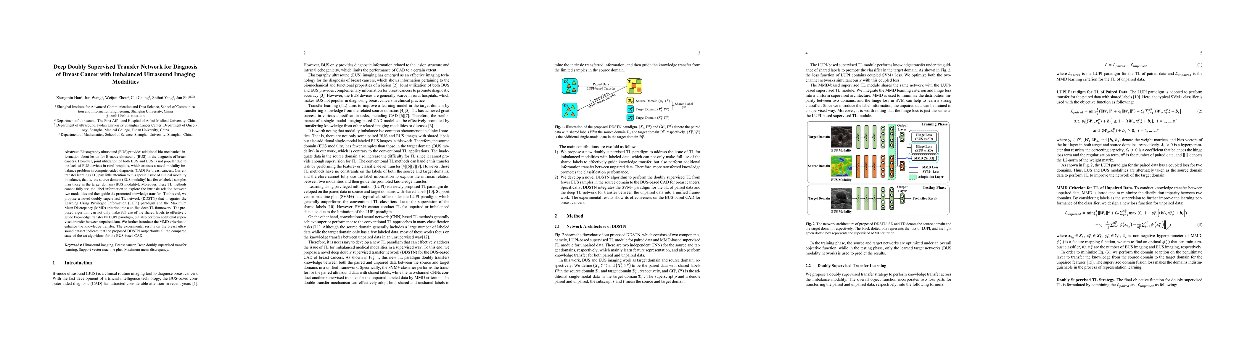 The paper proposes a Deep Doubly Supervised Transfer Network (DDSTN) to address the imbalance between B-mode ultrasound (BUS) and elastography ultrasound (EUS) modalities in breast cancer diagnosis. The DDSTN leverages the Learning Using Privileged Information (LUPI) paradigm and Maximum Mean Discrepancy (MMD) criterion to effectively transfer knowledge from the EUS domain to the BUS domain, outperforming existing state-of-the-art methods in computer-aided diagnosis.