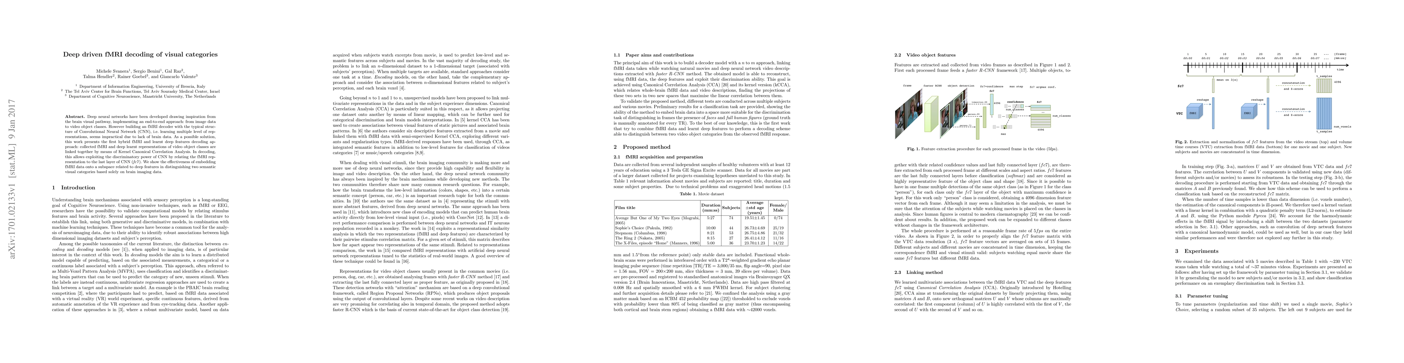 This research explores a novel hybrid approach combining fMRI data with deep neural network features to decode visual categories. By leveraging Kernel Canonical Correlation Analysis, the study links fMRI signals to the final layer of a Convolutional Neural Network, demonstrating effective discrimination of semantic visual categories using brain imaging data alone.