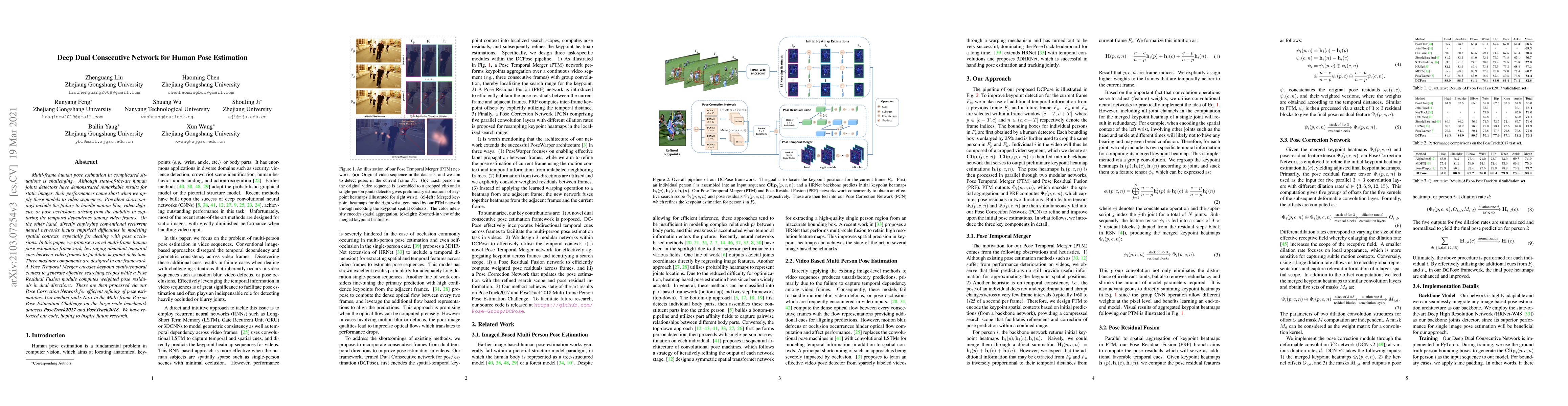 This paper proposes a Deep Dual Consecutive Network for multi-frame human pose estimation, addressing challenges like motion blur and pose occlusions by leveraging temporal dependencies. The framework includes a Pose Temporal Merger, Pose Residual Fusion, and Pose Correction Network, achieving top results in the Multi-frame Person Pose Estimation Challenge.